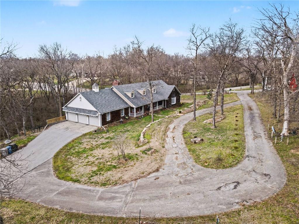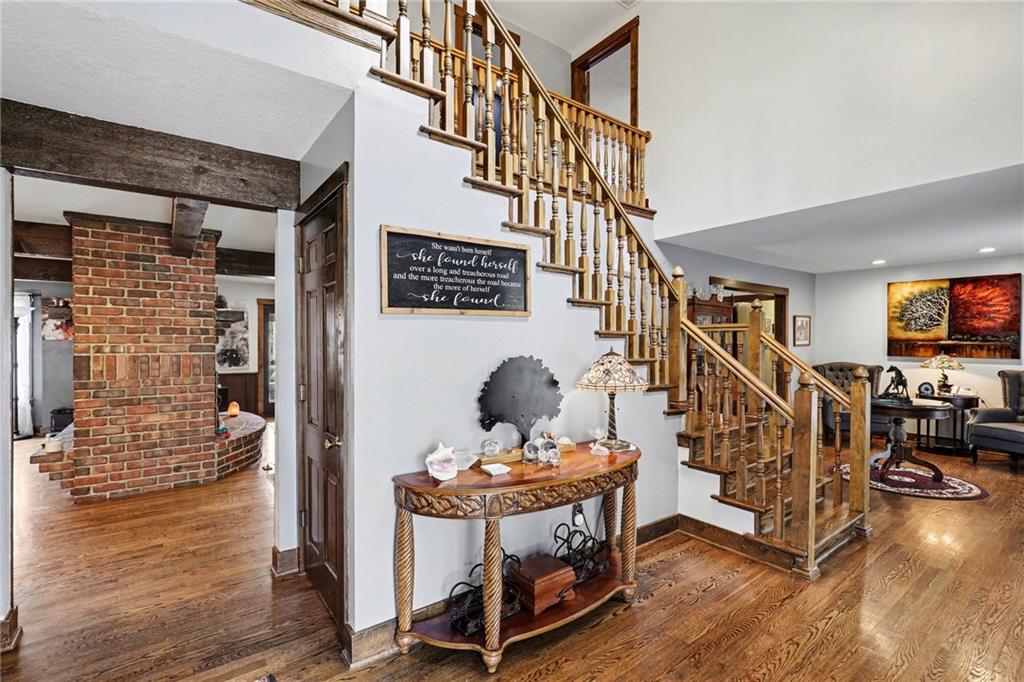 This charming, storybook home near the golf course is nestled on just over an acre with beautiful wooded views, offering character, space, and inviting farmhouse touches throughout. As you walk through the front door, you are greeted with original wood floors, open living spaces, and a gorgeous see through brick fireplace with a wood burning insert as the focal point of the living room. The dining room flows seamlessly from the living area and shares the two sided fireplace, while the spacious kitchen features granite countertops, a large pantry, and cottage inspired farmhouse charm. The primary bedroom is a true retreat with a bow window, hardwood floors, and an oversized walk in closet. The ensuite includes double sinks and a custom barn door. A second main level bedroom with its own bathroom, along with additional half baths, a laundry room, and a three car garage, complete the main floor. Upstairs offers two bedrooms and a full bathroom. The finished basement adds extra living space with a large recreation area, custom shuffleboard, a bedroom, full bathroom, generous storage, and a fourth garage, plus potential for a non conforming fifth bedroom or second kitchen. Outside, enjoy a spacious fenced backyard with a deck, covered gazebo, and patio, all backing to woods with golf course views. A charming fire pit with swings adds the perfect touch for relaxing or entertaining.