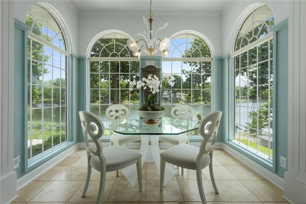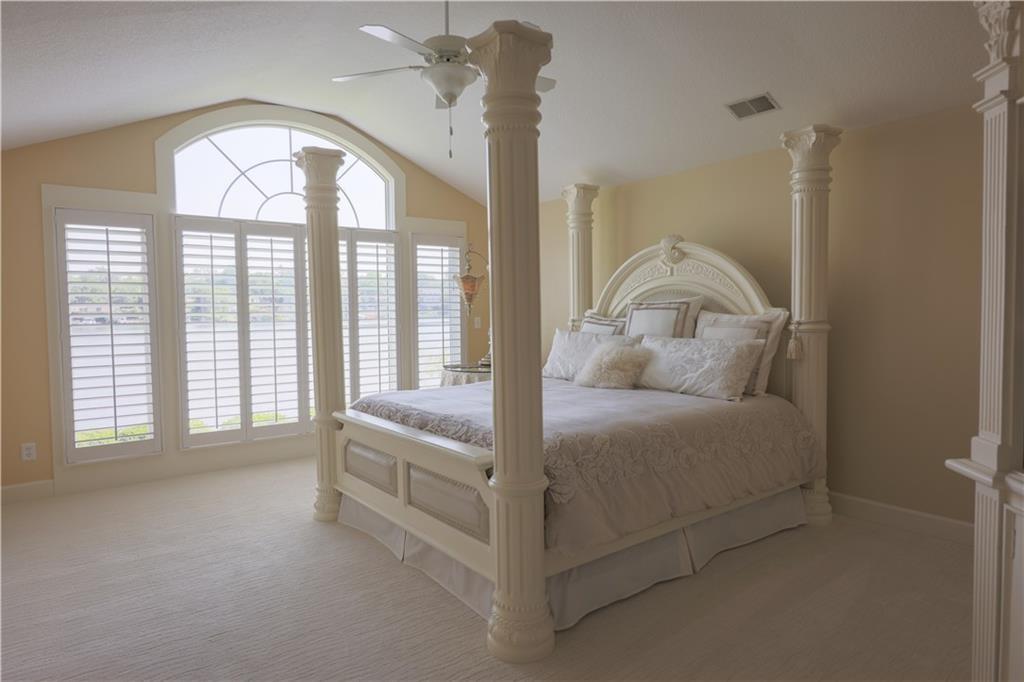 Tucked away on one of the most coveted lakefront lots in the Northland, this one-of-a-kind, custom-built home was thoughtfully designed by an interior designer to take full advantage of its breathtaking views. Nearly every room in this meticulously maintained residence has water views. Step into the grand foyer where soaring columns and faux marble accents set an elegant tone. From there, a second entry welcomes you with a barrel-vaulted, hand-painted ceiling and sweeping lake views that draw you further into the heart of the home. The French country-inspired kitchen is a dream for any entertainer or home chef, featuring a hand-selected marble island, custom cabinetry, a cozy stone fireplace, built-in entertainment center and desk, and an all-glass breakfast room with arched windows overlooking the lush, landscaped yard with multiple water features. The hearth room flows into a spacious living room with a see-through fireplace, a wall of glass framed with plantation shutters. The primary suite is a peaceful retreat with patio access, high ceilings, custom built-ins, upgraded carpet, and plantation shutters. The ensuite bath offers a spa-like experience with a dome ceiling over the soaking tub, walk-in shower, and dual vanities. A second bedroom also has direct patio access and features elegant travertine floors. Recently added second living quarters include a full gourmet kitchen, living area with built-ins, breakfast nook, second master suite with luxurious bath, large walk-in closet, and even a second laundry room—perfect for guests, in-laws, an adult child, or anyone looking for privacy and independence. The space also features its own private entrance. Additional highlights include a spacious three-car garage with high-end epoxy floors, a private dock with a pontoon boat included, full irrigation system, expansive patio and deck spanning the length of the home, and professional landscaping throughout. This is more than just a home—it's a lifestyle.