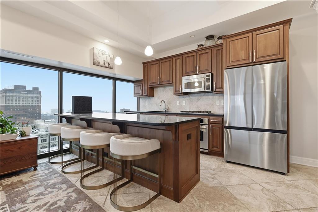 Perched on the 17th floor, this stunning 2-bedroom, 2.5-bath high-rise condo offers breathtaking views of the Kansas City skyline and the ultimate in walkable downtown living. The open living space features soaring ceilings, expansive windows, and incredible natural light, creating a dramatic setting for both everyday living and entertaining. The kitchen offers stainless steel appliances, a gas cooktop, and generous counter space, flowing seamlessly into the spacious living area where floor-to-ceiling windows frame the downtown skyline. The primary suite provides a peaceful retreat with beautiful city views and ample space, while the second bedroom and additional bath offer flexibility for guests or a home office. Residents enjoy exceptional building amenities, including 24-hour concierge service, a fitness center, a rooftop pool, a party room, secure building access, storage, and two garage parking spaces. A recent HVAC system upgrade (less than two years old) adds additional peace of mind. Located in the heart of downtown Kansas City with streetcar access just steps away, this home places restaurants, entertainment, and vibrant city life right outside your door!