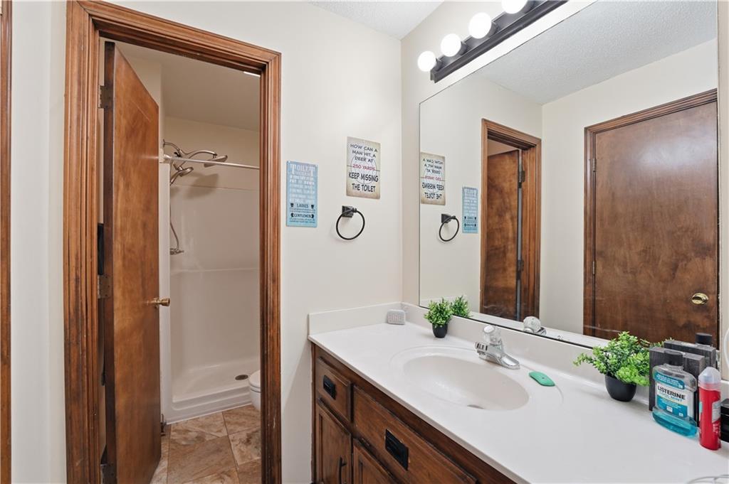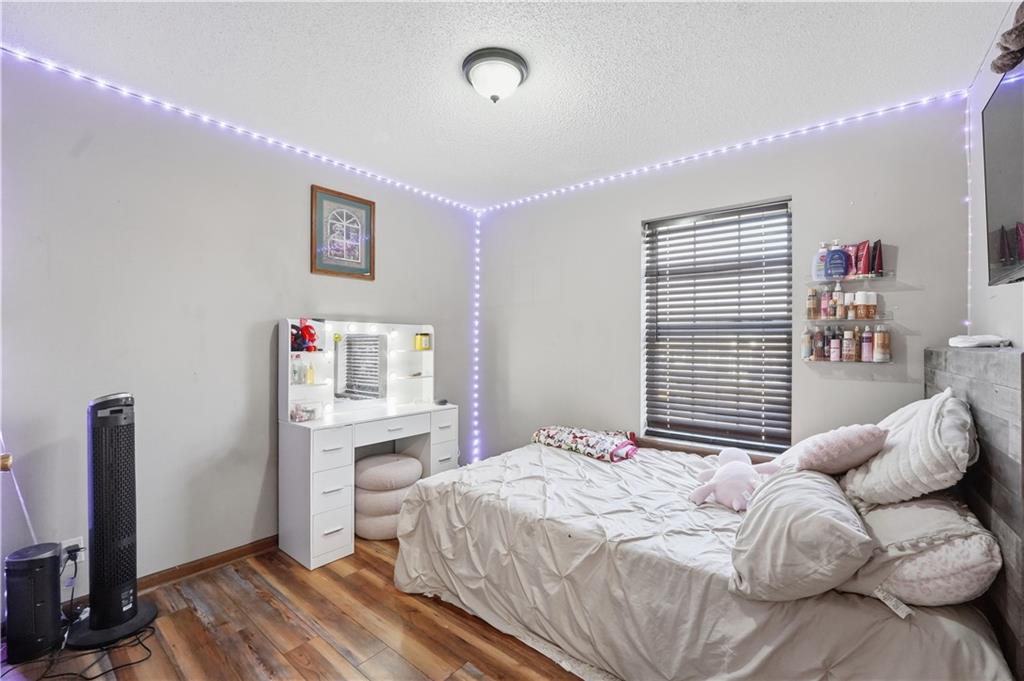 Situated on a peaceful cul-de-sac lot, this inviting split-entry home welcomes you with a spacious entryway accented by elegant iron railings. Step inside to discover laminate plank flooring throughout, adding modern style. The living room features a cozy fireplace with new electric insert, ceiling fan, and sleek iron railing that enhances the open, streamlined feel of the space. Updated eat in kitchen that walks out to a covered deck. The primary bedroom features a decorative box ceiling, ceiling fan, and a large walk-in closet, along with the convenience of an adjoining private bath. Laundry is located on the bedroom level. The finished lower level offers a spacious family room and a fourth bedroom featuring a stylish painted plank accent wall and attached bath. Large fenced backyard with covered deck and a paver patio surrounded by established trees.