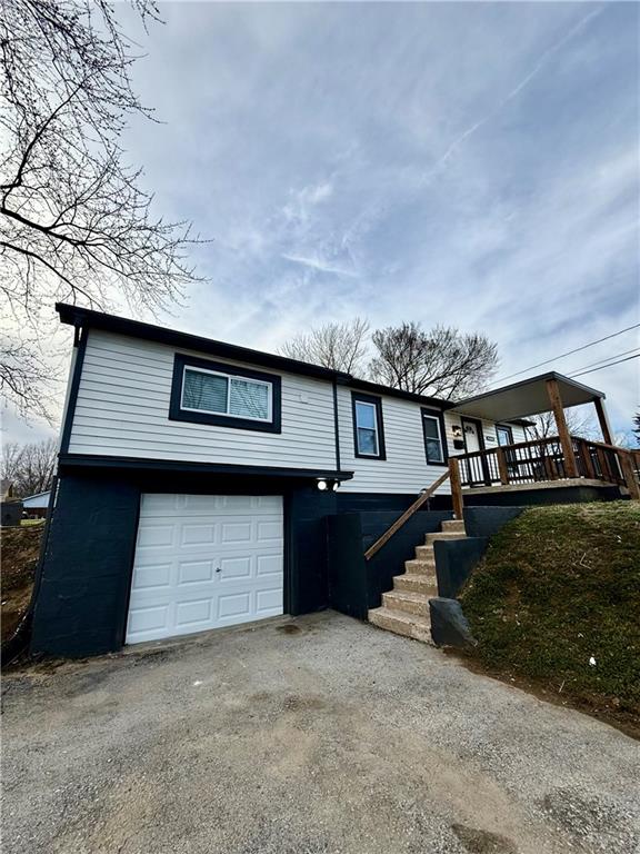 View of front of property with asphalt driveway, an attached garage, and a porch