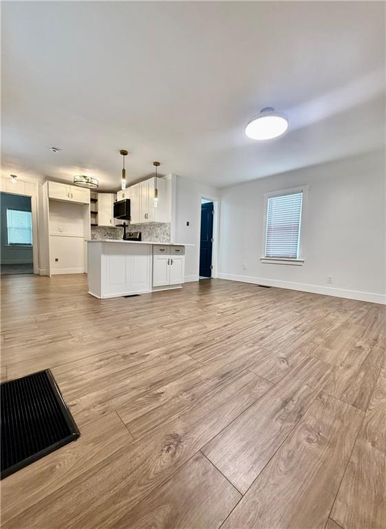Unfurnished living room featuring light wood-type flooring and baseboards