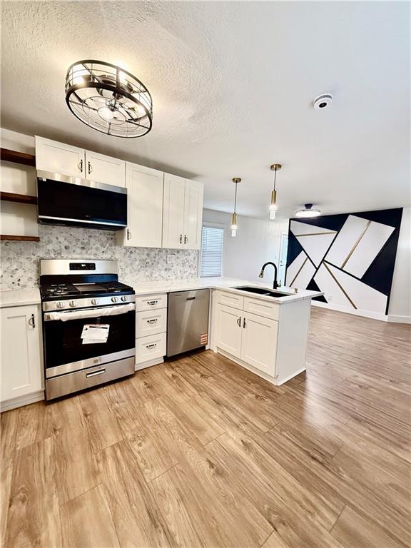 Kitchen with a peninsula, stainless steel appliances, white cabinets, pendant lighting, and a textured ceiling