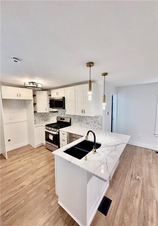 Kitchen with a peninsula, stainless steel appliances, white cabinets, hanging light fixtures, and light wood-style flooring