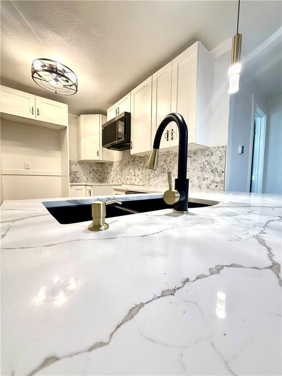 Kitchen with light stone counters, white cabinetry, and decorative backsplash