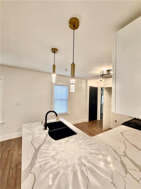 Kitchen featuring white cabinets, light stone countertops, dark wood-style floors, and pendant lighting