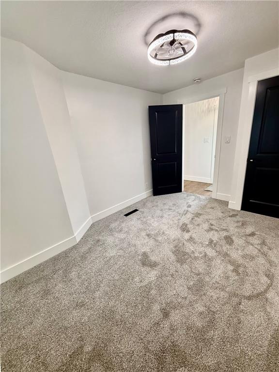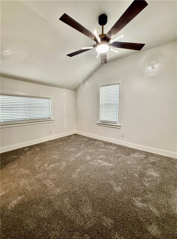 Empty room featuring dark carpet, lofted ceiling, and a ceiling fan