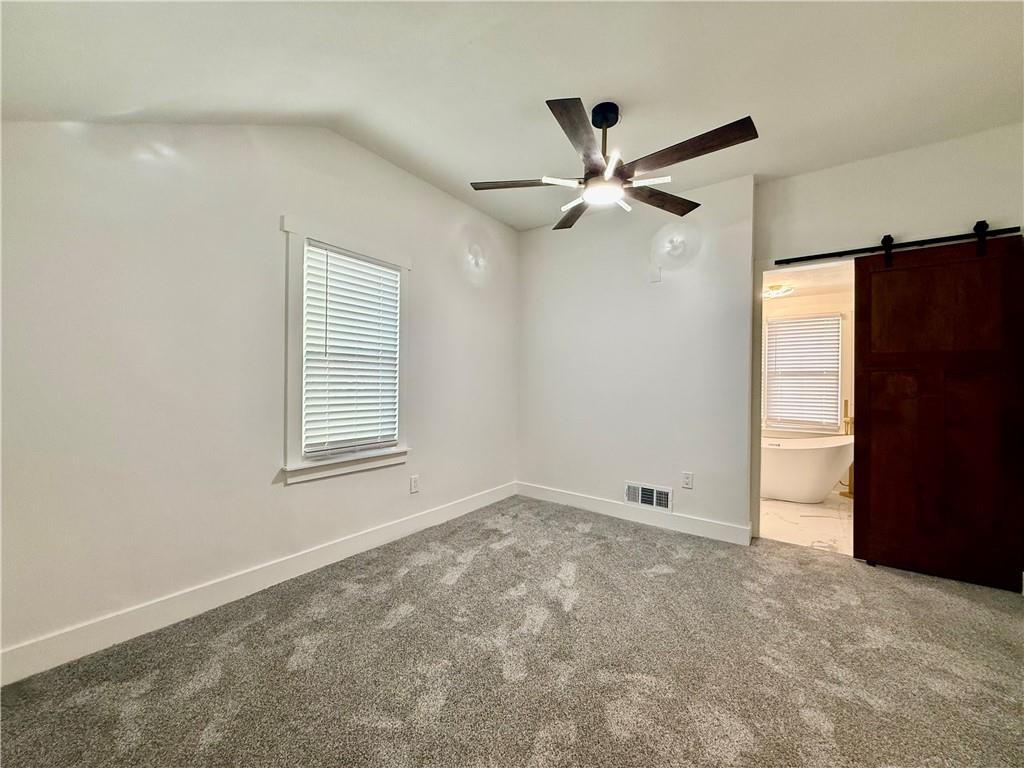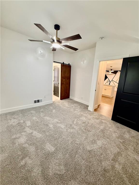 Unfurnished bedroom with a barn door, carpet floors, ceiling fan, connected bathroom, and vaulted ceiling