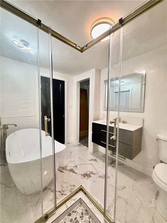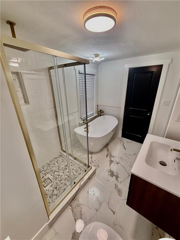 Primary Bathroom featuring vanity, light marble finish floors, a freestanding bath, a shower stall, and a textured ceiling