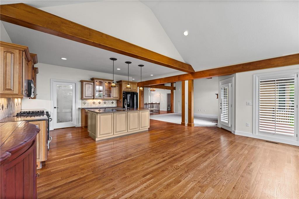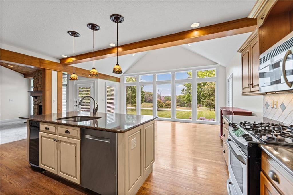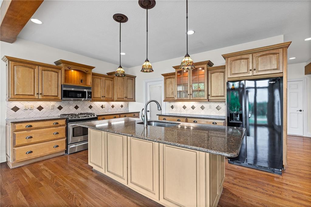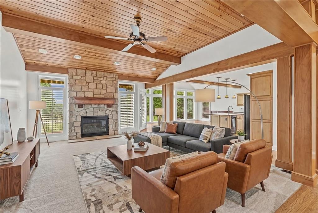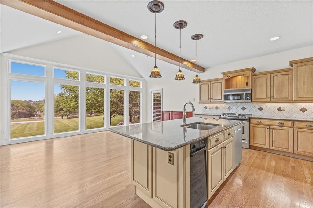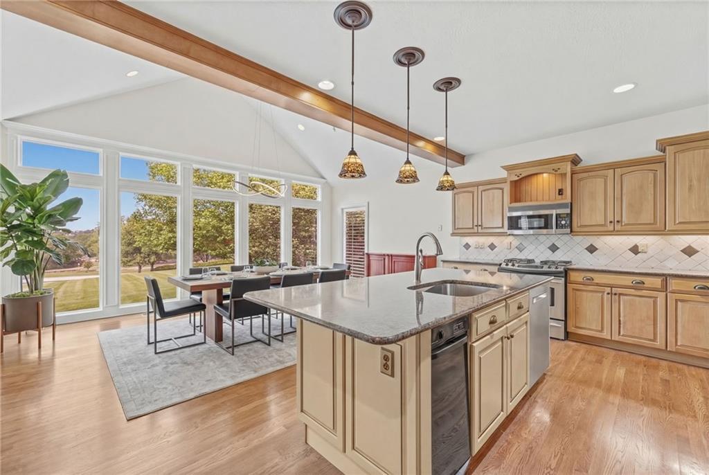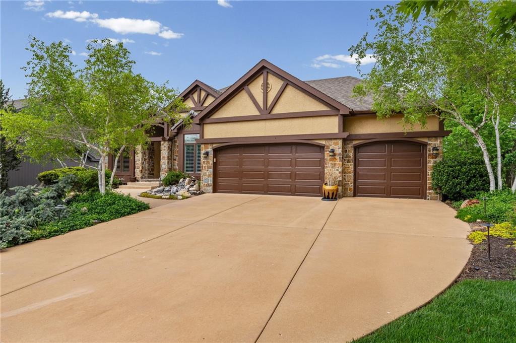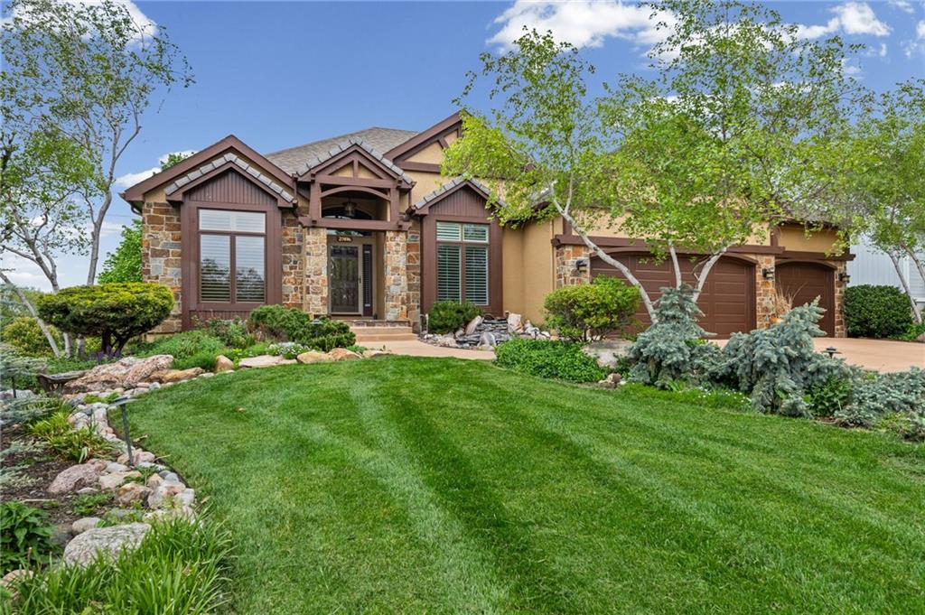 Welcome to the new and improved 20816 W 99th St. Stunning Custom Reverse 1.5-Story in Highland Crest with Falcon Valley Golf Course Views, now has all new carpet on the first floor and stairs, plus a freshly painted first level This beautifully custom designed and built reverse 1.5-story home in sought-after Highland Crest offers privacy, exceptional craftsmanship, and scenic views of Falcon Valley Golf Course. The professionally landscaped lot features mature trees, manicured shrubs, raised garden beds, and a tranquil waterfall water feature. With no neighbors behind, creating a peaceful and private outdoor setting. The striking all-stucco exterior with elegant natural stone accents provides outstanding curb appeal. Inside, the thoughtfully designed floor plan showcases rich hardwood floors, exposed wood beams, and tongue-and-groove wood ceilings that add warmth and character throughout the main living spaces. The chef’s kitchen features beautiful stained cabinetry, quartz countertops, stainless steel appliances, a spacious dining area and a large walk-in pantry—perfect for both everyday living and entertaining. A private office provides a quiet work-from-home space. The main-level primary suite offers a relaxing retreat with a large walk-in shower with seamless glass and an expansive walk-in closet with custom built-ins. A convenient half bathroom and main-floor laundry room completes the level. The daylight lower level is ideal for entertaining and recreation, with enough room to add a 4th bedroom and featuring a spacious rec room with luxury vinyl flooring, a dedicated area for a pool table, two additional bedrooms, and a full bathroom. There is also abundant storage space, along with updated HVAC and whole-home water filtration system Located within easy walking distance to the neighborhood pool and just minutes from Lenexa City Center, shopping, dining, and highways. highly regarded Olathe Schools