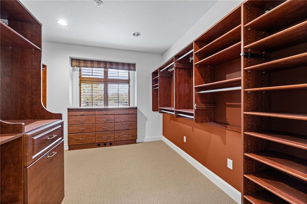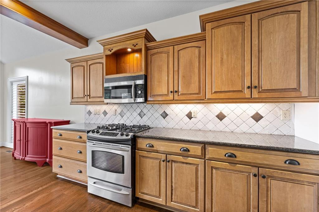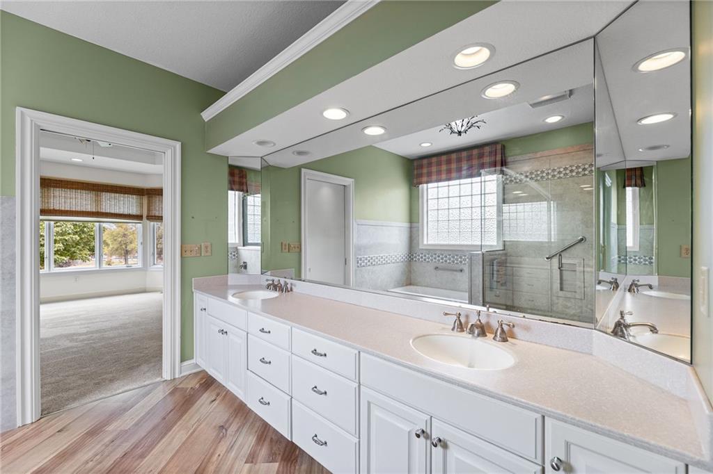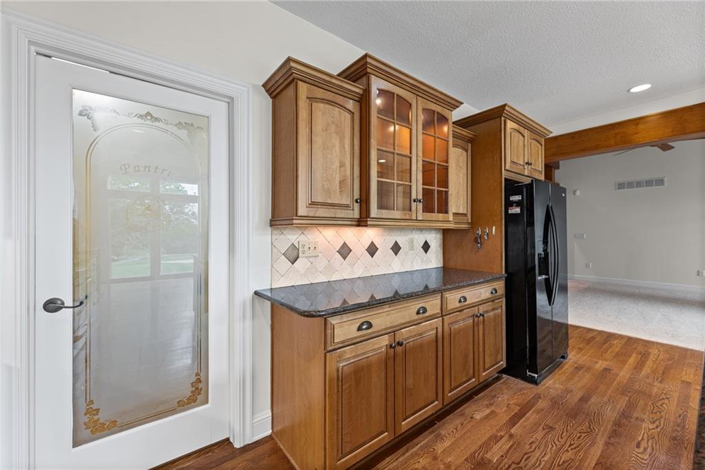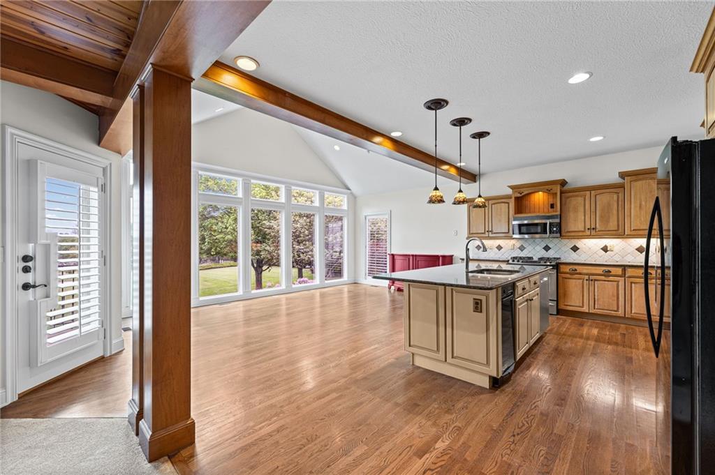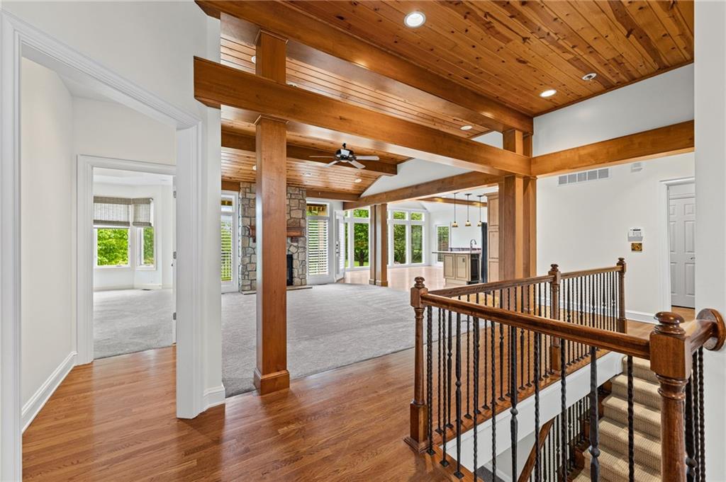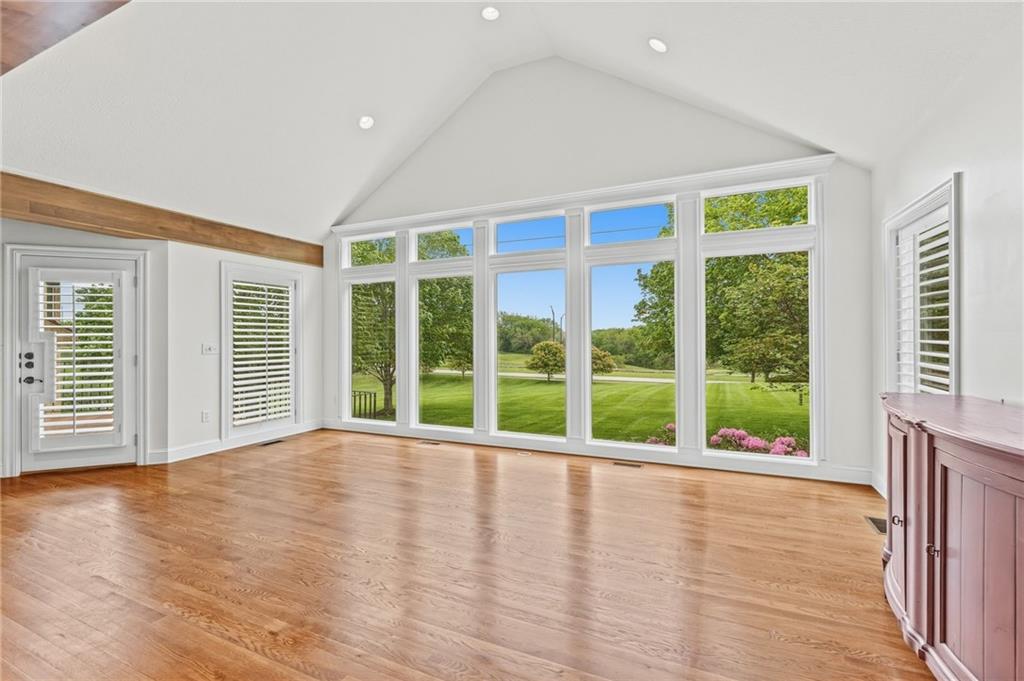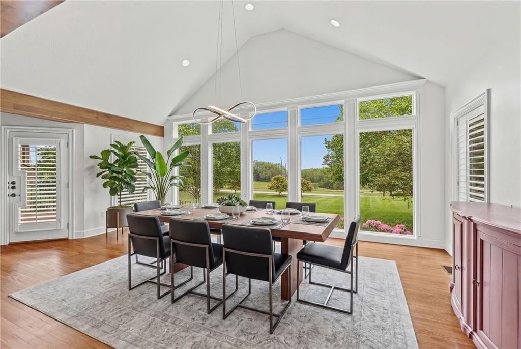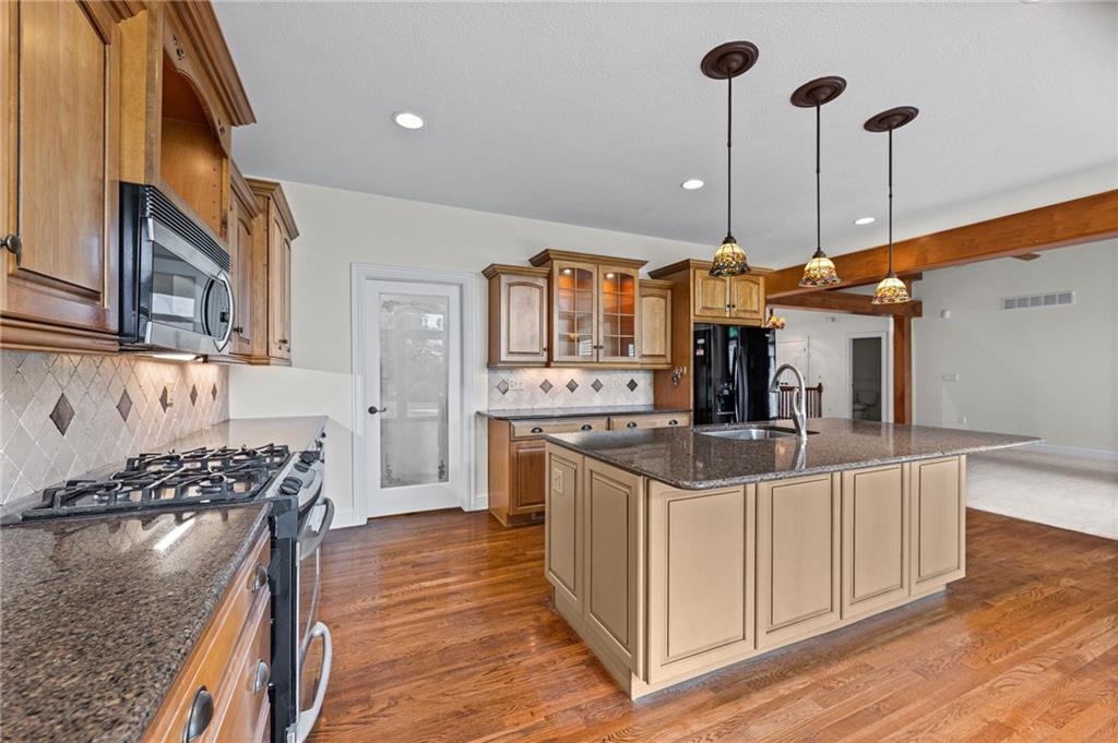 Welcome to the new and improved 20816 W 99th St. Stunning Custom Reverse 1.5-Story in Highland Crest with Falcon Valley Golf Course Views, now has all new carpet on the first floor and stairs, plus a freshly painted first level This beautifully custom designed and built reverse 1.5-story home in sought-after Highland Crest offers privacy, exceptional craftsmanship, and scenic views of Falcon Valley Golf Course. The professionally landscaped lot features mature trees, manicured shrubs, raised garden beds, and a tranquil waterfall water feature. With no neighbors behind, creating a peaceful and private outdoor setting. The striking all-stucco exterior with elegant natural stone accents provides outstanding curb appeal. Inside, the thoughtfully designed floor plan showcases rich hardwood floors, exposed wood beams, and tongue-and-groove wood ceilings that add warmth and character throughout the main living spaces. The chef’s kitchen features beautiful stained cabinetry, quartz countertops, stainless steel appliances, a spacious dining area and a large walk-in pantry—perfect for both everyday living and entertaining. A private office provides a quiet work-from-home space. The main-level primary suite offers a relaxing retreat with a large walk-in shower with seamless glass and an expansive walk-in closet with custom built-ins. A convenient half bathroom and main-floor laundry room completes the level. The daylight lower level is ideal for entertaining and recreation, with enough room to add a 4th bedroom and featuring a spacious rec room with luxury vinyl flooring, a dedicated area for a pool table, two additional bedrooms, and a full bathroom. There is also abundant storage space, along with updated HVAC and whole-home water filtration system Located within easy walking distance to the neighborhood pool and just minutes from Lenexa City Center, shopping, dining, and highways. highly regarded Olathe Schools