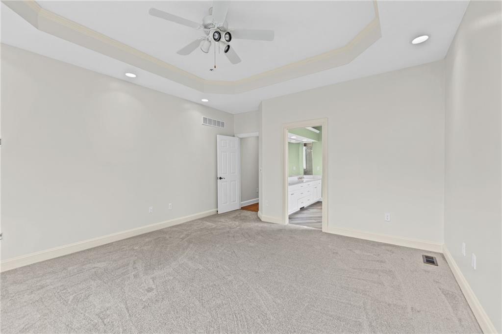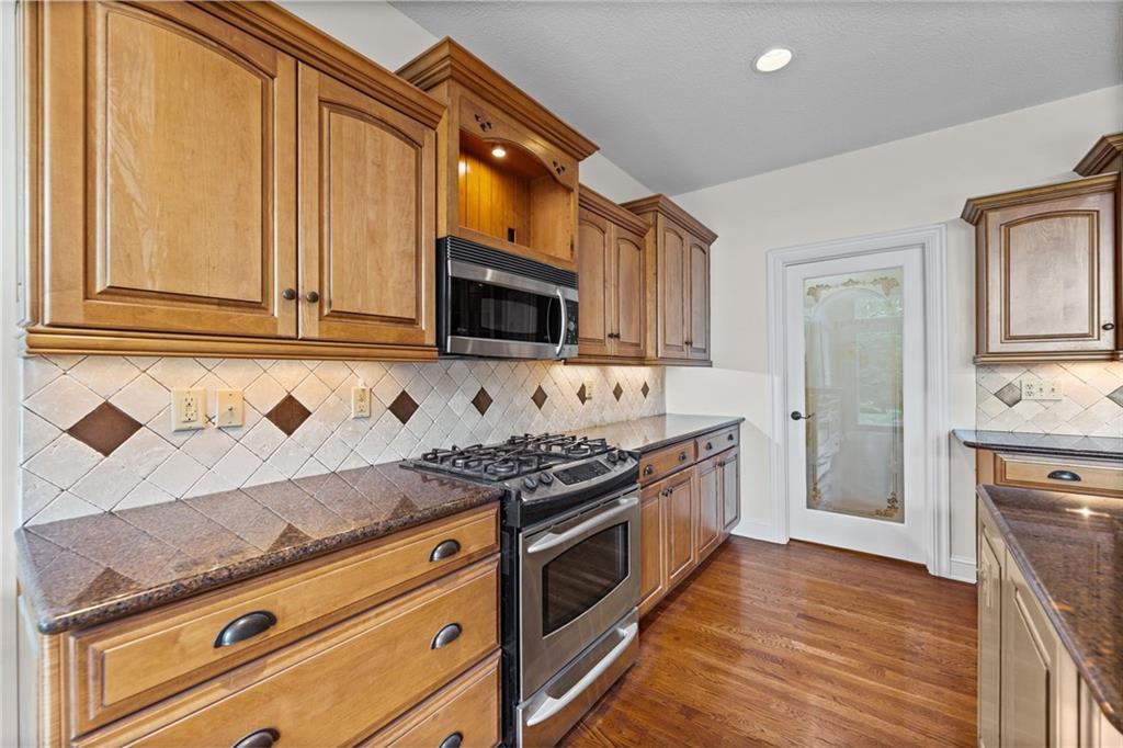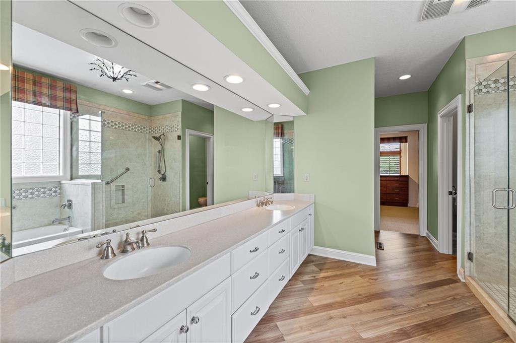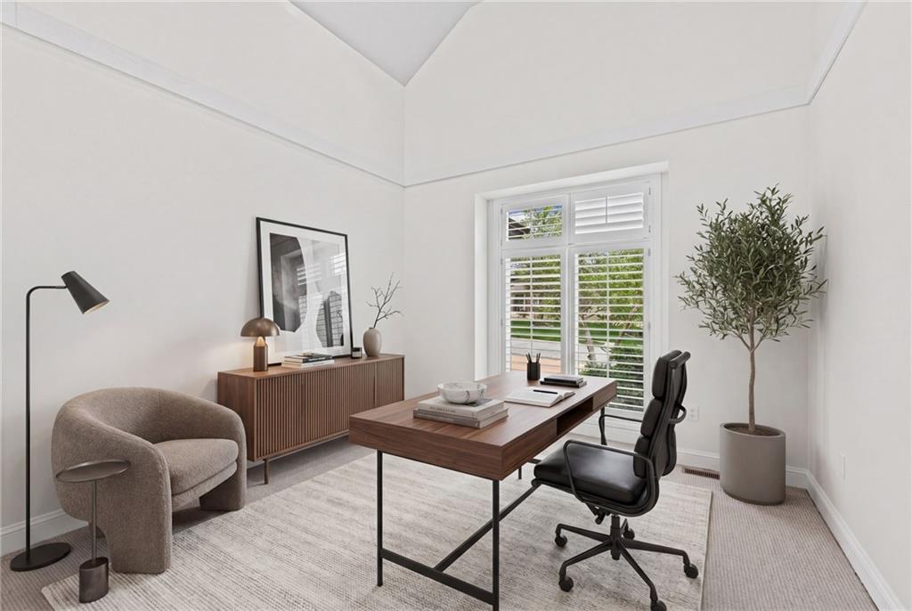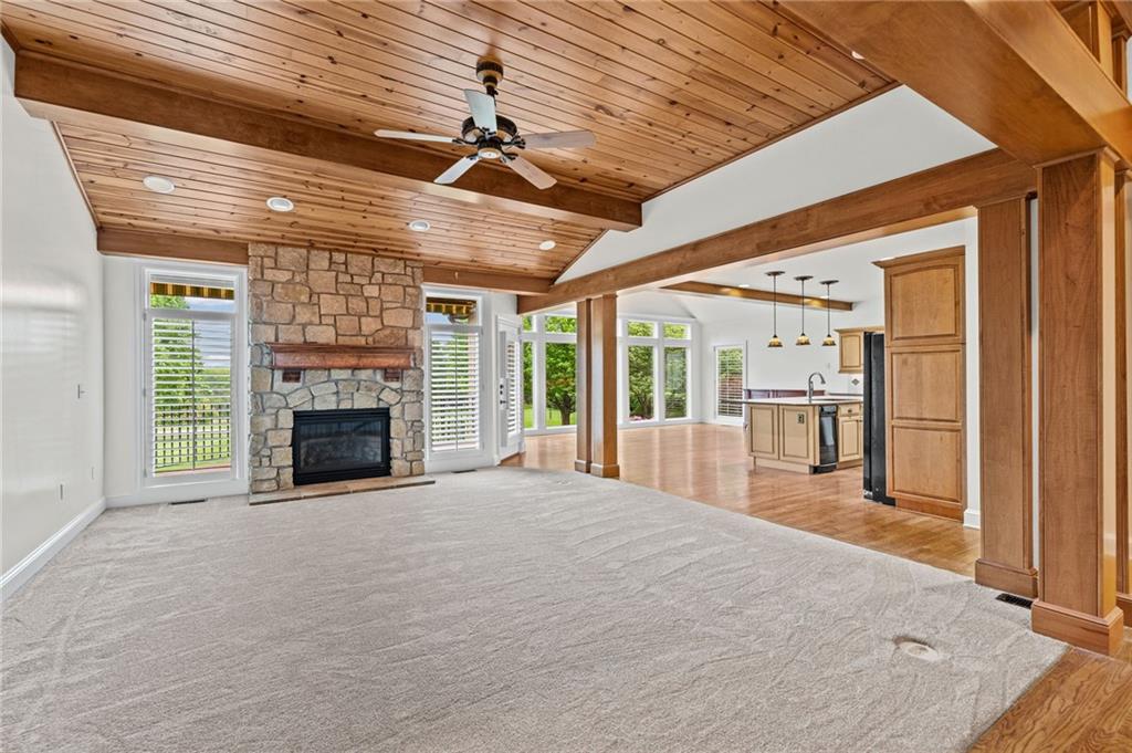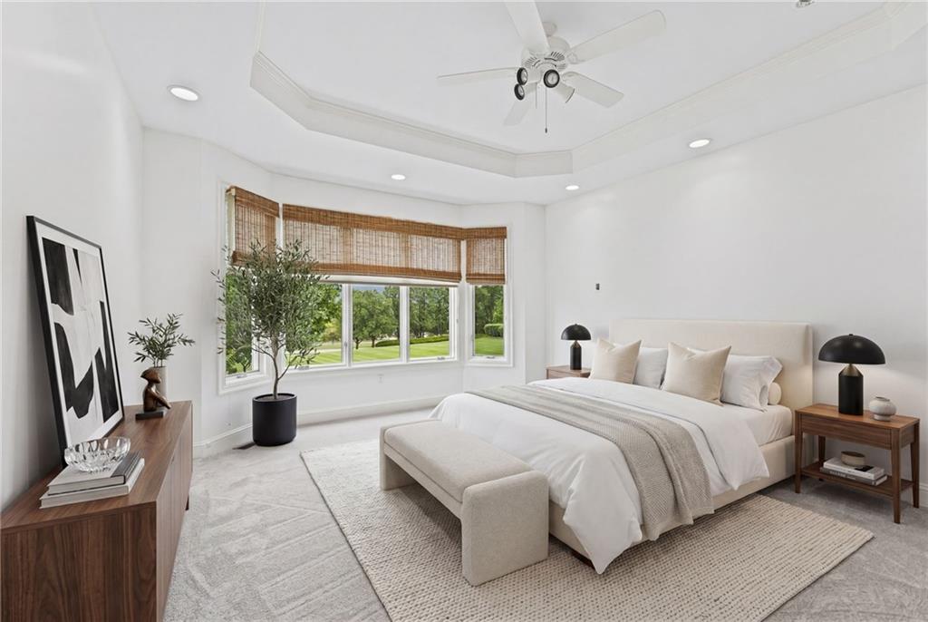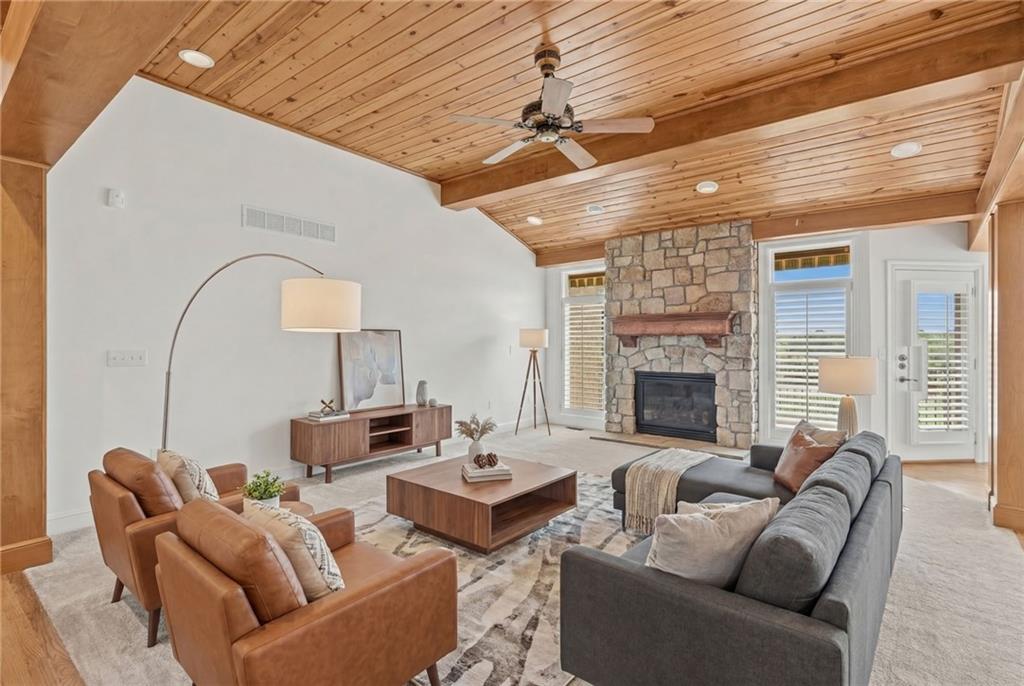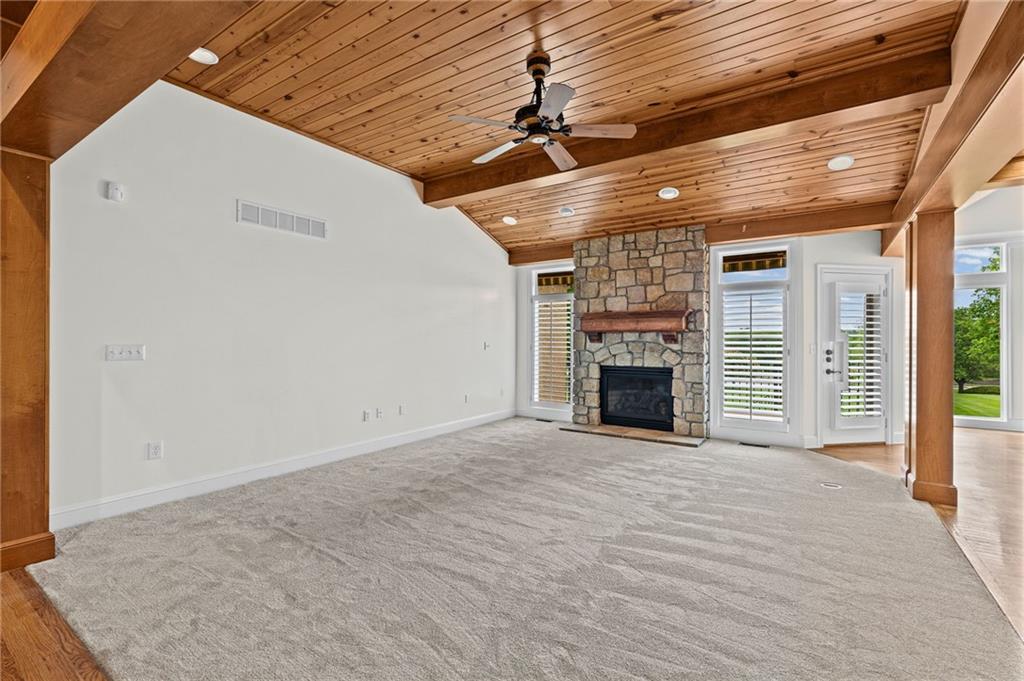 Welcome to the new and improved 20816 W 99th St. Stunning Custom Reverse 1.5-Story in Highland Crest with Falcon Valley Golf Course Views, now has all new carpet on the first floor and stairs, plus a freshly painted first level This beautifully custom designed and built reverse 1.5-story home in sought-after Highland Crest offers privacy, exceptional craftsmanship, and scenic views of Falcon Valley Golf Course. The professionally landscaped lot features mature trees, manicured shrubs, raised garden beds, and a tranquil waterfall water feature. With no neighbors behind, creating a peaceful and private outdoor setting. The striking all-stucco exterior with elegant natural stone accents provides outstanding curb appeal. Inside, the thoughtfully designed floor plan showcases rich hardwood floors, exposed wood beams, and tongue-and-groove wood ceilings that add warmth and character throughout the main living spaces. The chef’s kitchen features beautiful stained cabinetry, quartz countertops, stainless steel appliances, a spacious dining area and a large walk-in pantry—perfect for both everyday living and entertaining. A private office provides a quiet work-from-home space. The main-level primary suite offers a relaxing retreat with a large walk-in shower with seamless glass and an expansive walk-in closet with custom built-ins. A convenient half bathroom and main-floor laundry room completes the level. The daylight lower level is ideal for entertaining and recreation, with enough room to add a 4th bedroom and featuring a spacious rec room with luxury vinyl flooring, a dedicated area for a pool table, two additional bedrooms, and a full bathroom. There is also abundant storage space, along with updated HVAC and whole-home water filtration system Located within easy walking distance to the neighborhood pool and just minutes from Lenexa City Center, shopping, dining, and highways. highly regarded Olathe Schools