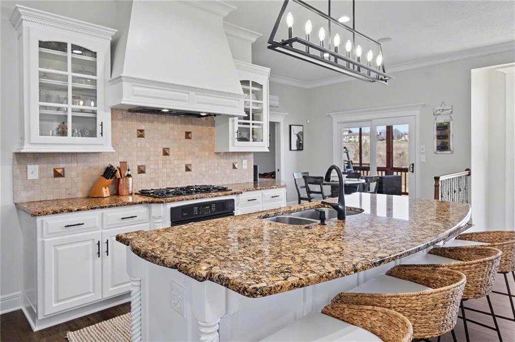 Unique opportunity to own an expertly crafted luxury home located in a quiet neighborhood. Soaring ceilings, high end finishes, 1,380 sq ft of unfinished storage with natural light and windows everywhere. Major expense updating trim & cabinet paint, double HVACs, flooring, lighting, etc. Kitchen has double wall ovens, gas cooktop, a large kitchen island next to a screened in deck overlooking all of the land going down to the lake that the neighbor owns. Formal dining room offers a refined space for entertaining or hosting special holiday gatherings. Guest room on the front and office/3rd bedroom on the back. The full walkout basement has even more living space with 2additional bedrooms and a large second living area. A wet bar complete with a pantry, refrigerator, dishwasher, and microwave perfect for hosting guests or watching movies. Enjoy colorful Kansas sunsets in your back yard with no HOA to answer to.