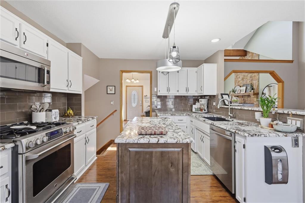 Tucked away at the end of a quiet cul-de-sac, this inviting 4 bedroom, 2.5 bath home offers the perfect mix of comfort, entertaining space and location. Inside, the living room welcomes you with vaulted ceilings and a striking stone fireplace. The updated kitchen features white cabinetry, granite countertops and a gas stove. Upstairs you’ll find the primary suite with walk-in closet and updated primary bathroom along with two additional bedrooms and a full bath. The lower-level fourth bedroom offers great flexibility and works perfectly as a home office or workout space, with a convenient walkout to the backyard. The finished basement is made for entertaining, featuring a recreation area with a full bar. Step outside to a fully fenced backyard with an above-ground pool and surrounding deck, perfect for summer gatherings. Easy access to everything Lee’s Summit offers makes this home one you won’t want to miss!