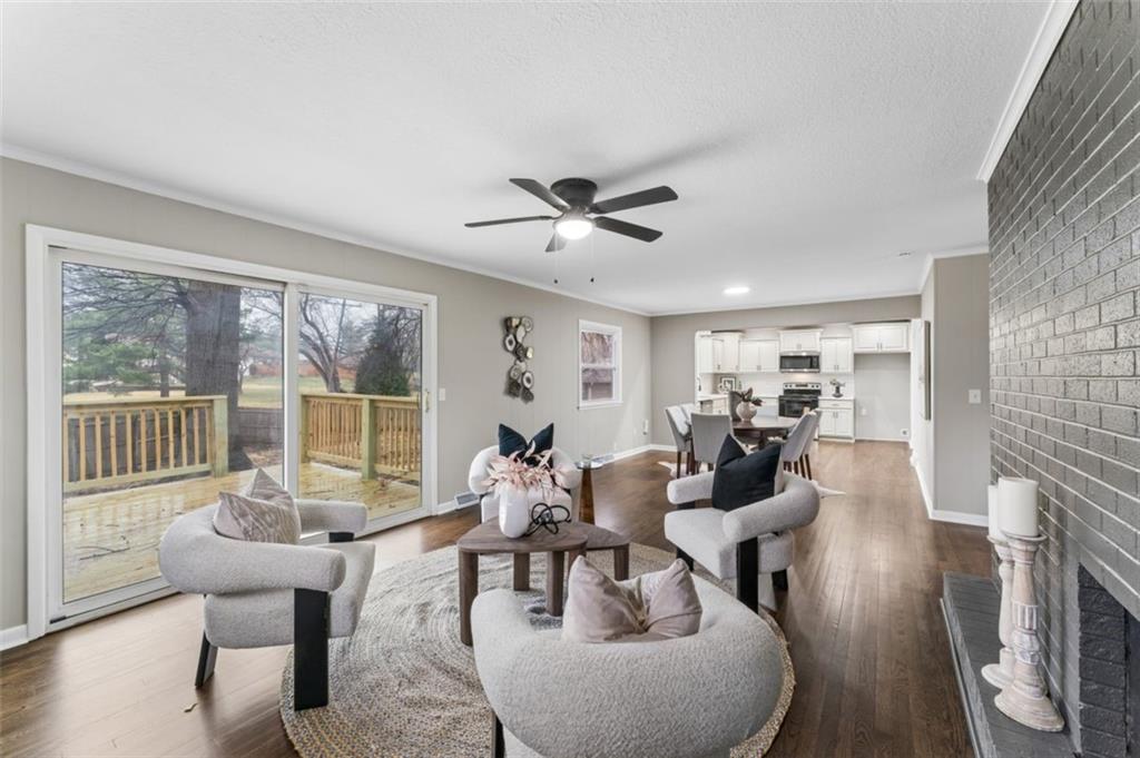 Beautifully remodeled 5 bedroom, 2.5 bath home offering over 3,500 finished square feet of living space. The main level features refinished hardwood floors, a spacious living area with a striking brick fireplace, and an open layout that flows into the fully updated kitchen with quartz countertops, custom cabinetry, stainless steel appliances, and subway tile backsplash. Sliding doors lead to a deck overlooking the backyard, perfect for relaxing or entertaining. The finished lower level provides over 1,400 additional square feet of flexible living space ideal for a family room, office, or guest area. Move-in ready with modern updates throughout and conveniently located near shopping, dining, and major highways.