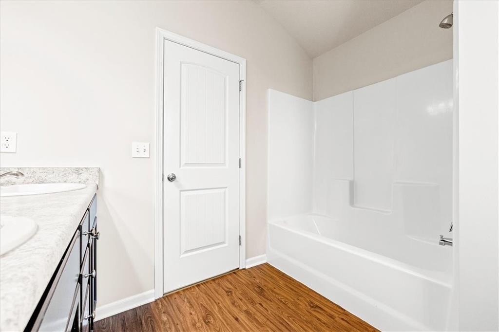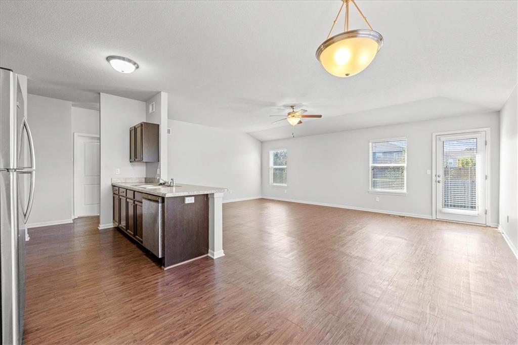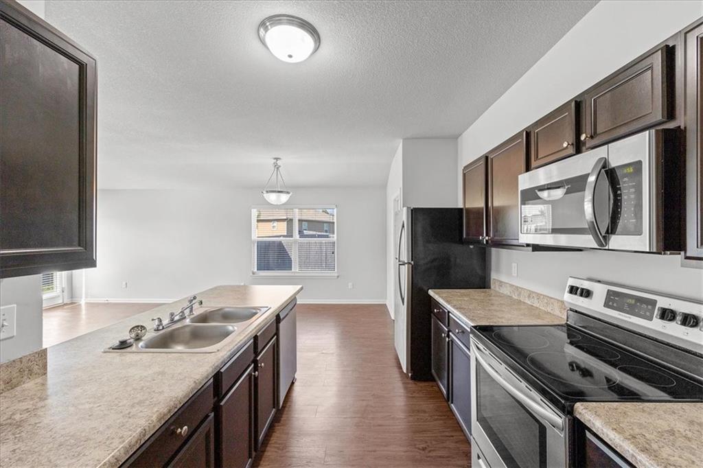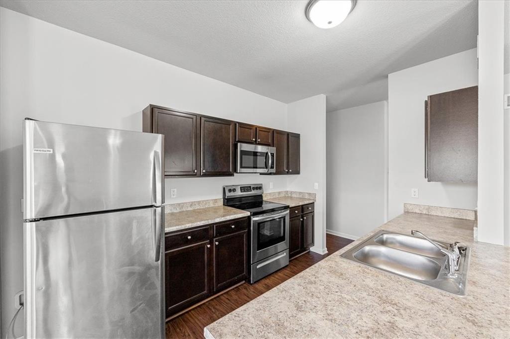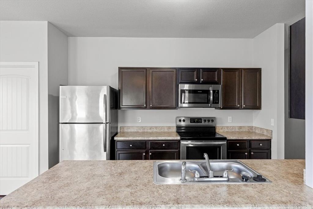 This is a single-family residence offering approximately 1,510 square feet of interior living area. The layout includes 3 bedrooms and 2 full bathrooms. The home is equipped with a 2-car attached garage. Interior features include a functional kitchen with stainless steel appliances and an electric range. The primary bedroom has a double vanity, shower/tub combination, and walk-in closet. Floor plan provides standard room sizes with adequate natural lighting. Located within a planned community with similar style homes.