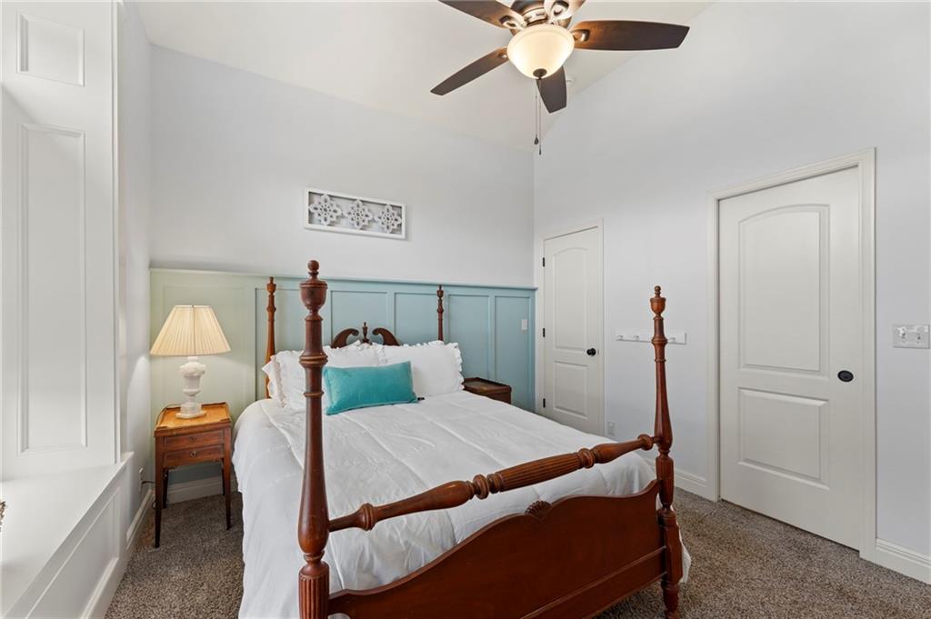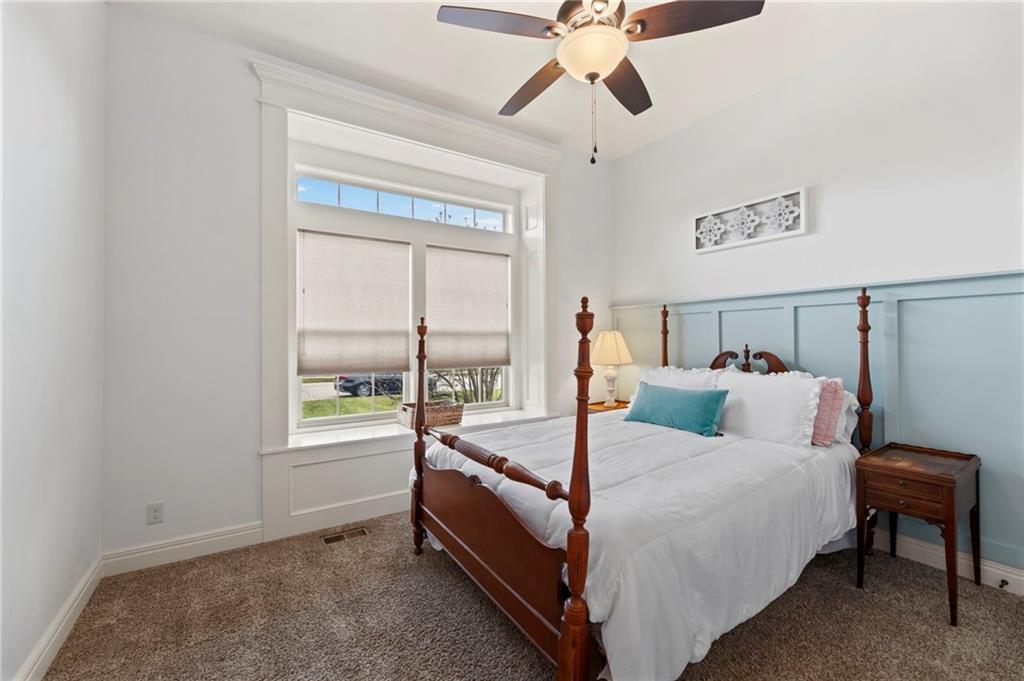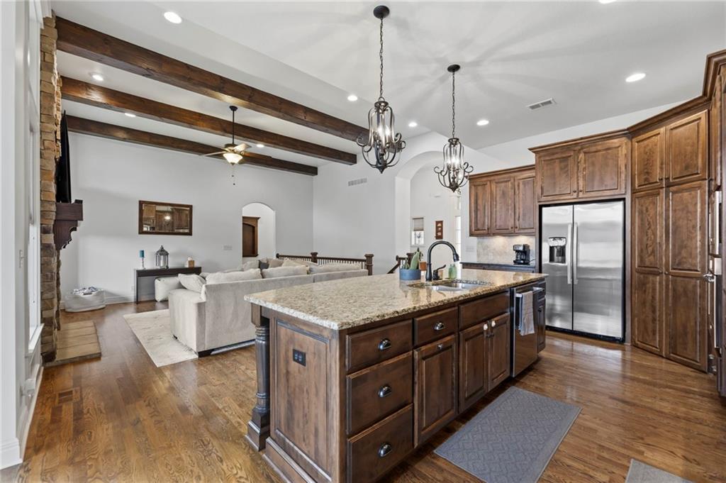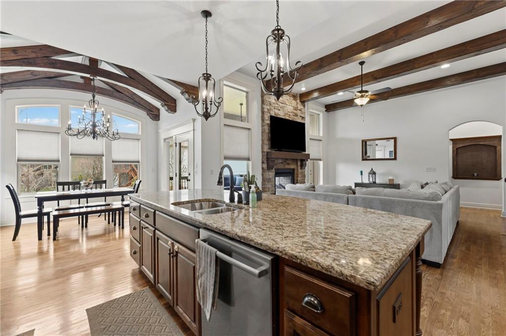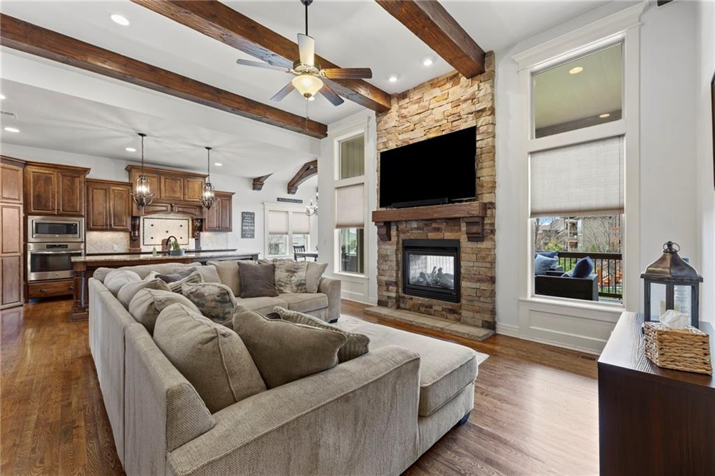 This fabulous Reverse 1.5 Story offers a blend of Craftsman detail and modern comfort. The open-concept layout features vaulted ceilings with exposed beams, hardwood floors, and a floor-to-ceiling stone, see-through fireplace creating a seamless indoor-outdoor connection. The spacious kitchen offers a large granite island, custom cabinetry, built-in appliances, and a walk-in pantry. Dining area is filled with natural light and connects seamlessly to the main living space. Spacious primary suite features tray ceilings and a well-appointed bath with granite double vanity, soaking tub, and walk-in shower, along with a generous walk-in closet. A second bedroom is located on the main level. The finished walkout lower level includes two additional bedrooms with large walk-in closets, a family room, and a full wet bar, offering excellent space for entertaining and everyday living with easy access to outdoor areas. Located in the desirable Southbridge/Stonebridge community, residents enjoy access to multiple neighborhood amenities including four zero-entry pools (one Junior Olympic size), two clubhouses with fitness facilities, playgrounds, pickleball courts, volleyball areas, and connected walking trails. Just minutes away, Heritage Park offers over 1,200 acres of recreation including a 40-acre lake, off-leash dog park, disc golf course, golf course and driving range, picnic shelters, trails, and multiple athletic fields for soccer, football, and more. Convenient access to nearby shopping, dining, and major highways adds to the appeal, making this location ideal for both everyday living and easy commuting.