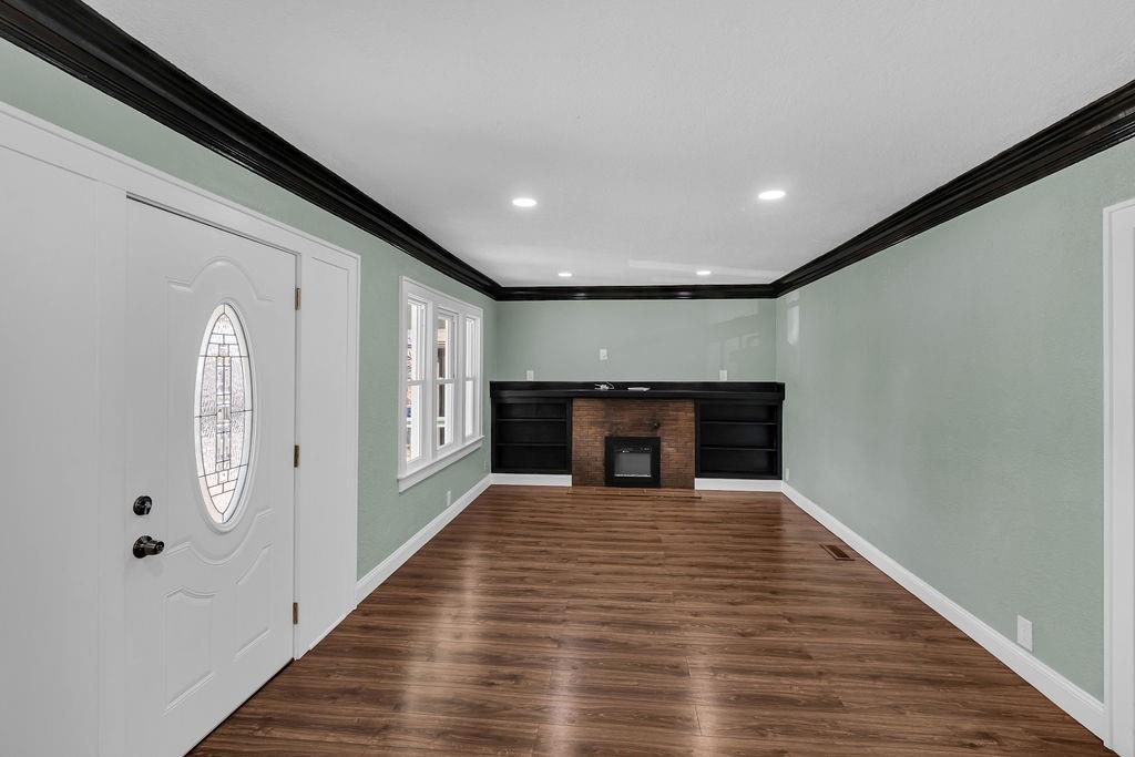 Fully renovated craftsman bungalow with charming curb appeal and thoughtful updates throughout! The covered front porch, gray lap siding, brick columns, and stone foundation give this home a classic look with fresh finishes. Step inside to find LVP flooring, dark crown molding, and recessed lighting throughout the main living areas. The living room features a brick fireplace flanked by built-in bookshelves. The updated kitchen offers white cabinetry, stone-look countertops, an exposed brick backsplash, and a breakfast bar that opens to the dining area. The bathroom has been refreshed with a tub/shower combo, glass slider door, and black hardware accents. The unfinished basement provides excellent storage or future finishing potential, with new plumbing already in place. Don't miss this move-in ready home with character and updates you won't find at this price point!