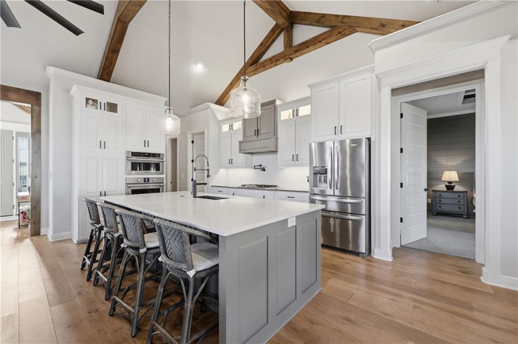 Beautiful custom-built, one-owner reverse 1.5 story offering quality craftsmanship and thoughtful upgrades throughout. This stunning home features soaring ceilings with exposed beams, creating a warm and inviting open floor plan. The spacious kitchen is equipped with high-end KitchenAid appliances, ample cabinetry, and flows seamlessly to an enclosed deck just off the kitchen—perfect for relaxing or entertaining. Enjoy the comfort of heated floors, custom blinds, tankless hot water, and dual-zoned HVAC for year-round efficiency. The main level offers generous living space while the finished walkout basement expands the home with additional living areas, bar, and plenty of room for guests or entertaining. This home includes 3 bedrooms and 4 bathrooms, providing space and privacy for everyone. You will appreciate the oversized 3-car garage featuring durable epoxy floors. Enjoy a lush, well maintained lawn made easy with a full ground sprinkler system. A rare opportunity to own a beautifully maintained custom home with premium upgrades and exceptional attention to detail.