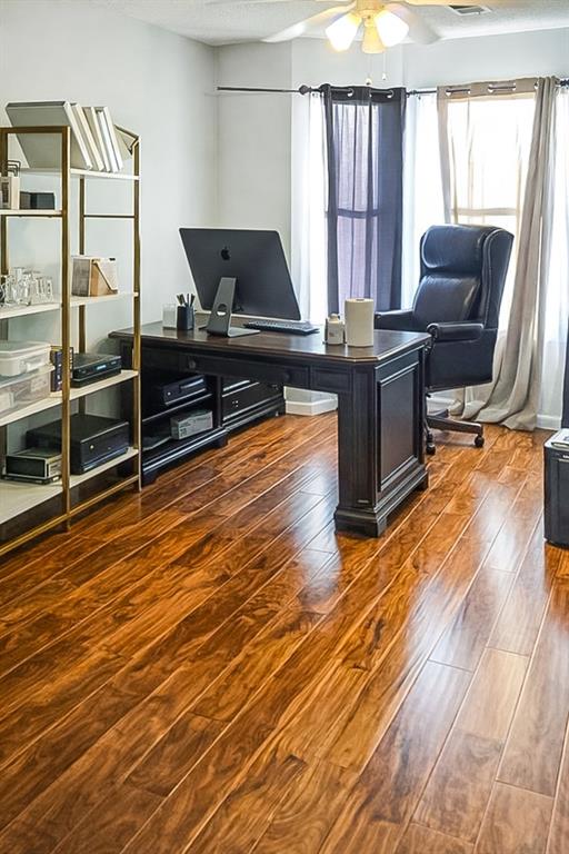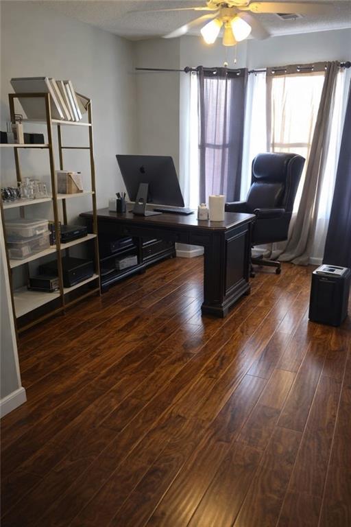 Office area with a textured ceiling, dark wood finished floors, and a ceiling fan