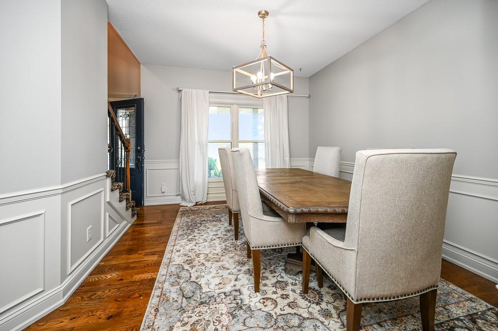 Dining area featuring a decorative wall, a wainscoted wall, hanging lights, and dark wood-style floors