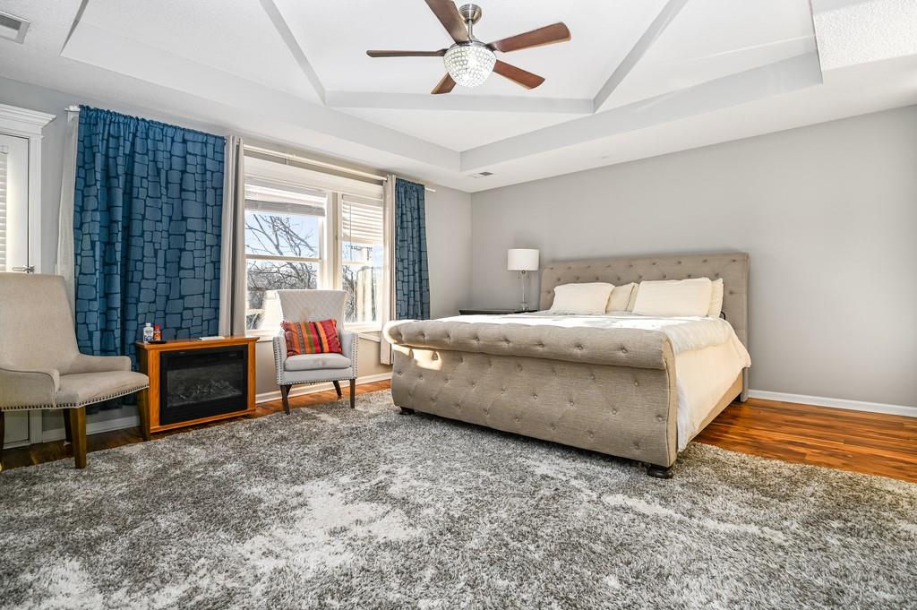 Bedroom featuring a tray ceiling, a ceiling fan, and wood finished floors