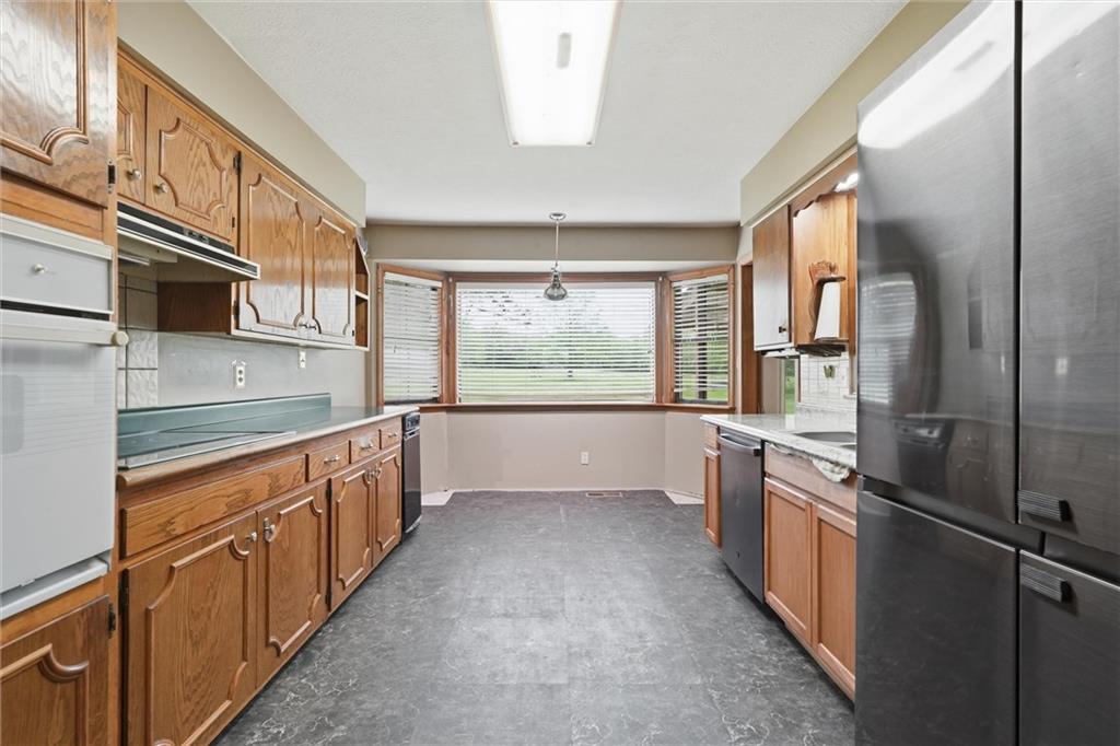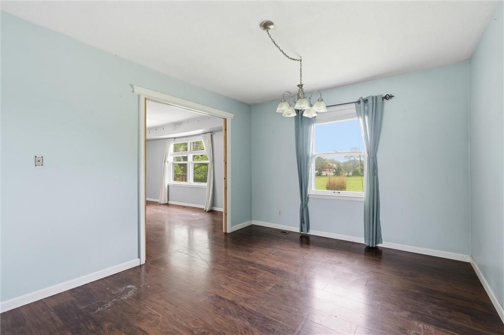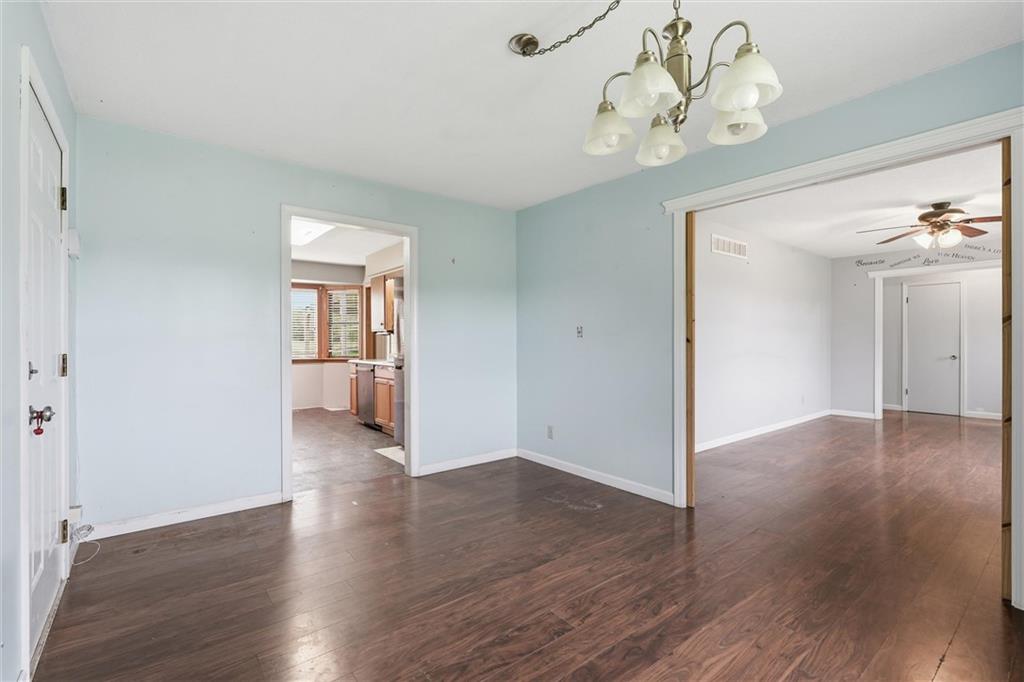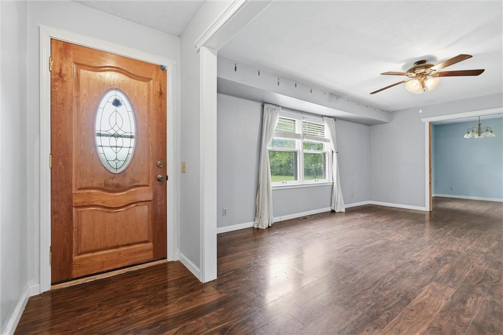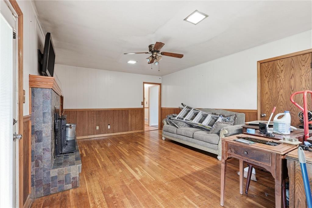Country living at its best on acreage with room to spread out! This spacious ranch sits on a beautiful, private setting featuring a mix of open pasture and mature trees—perfect for those looking for space, privacy, or a hobby farm setup. A large outbuilding/shop provides excellent storage for equipment, toys, or livestock needs, along with an additional detached garage. Inside, you’ll find a functional layout with hardwood floors, a cozy wood-burning fireplace, and plenty of natural light. The kitchen offers ample cabinet space and overlooks the scenic backyard. The primary suite includes a large bathroom with double vanity and soaking tub. The full basement offers additional living space potential with a finished area and room to customize, plus plenty of storage. Step outside and enjoy wide-open views, established trees, and endless possibilities for outdoor living, gardening, or recreation. Conveniently located with easy access while still offering that peaceful, rural feel—this property is a rare opportunity to own usable acreage with multiple outbuildings and space to make it your own!