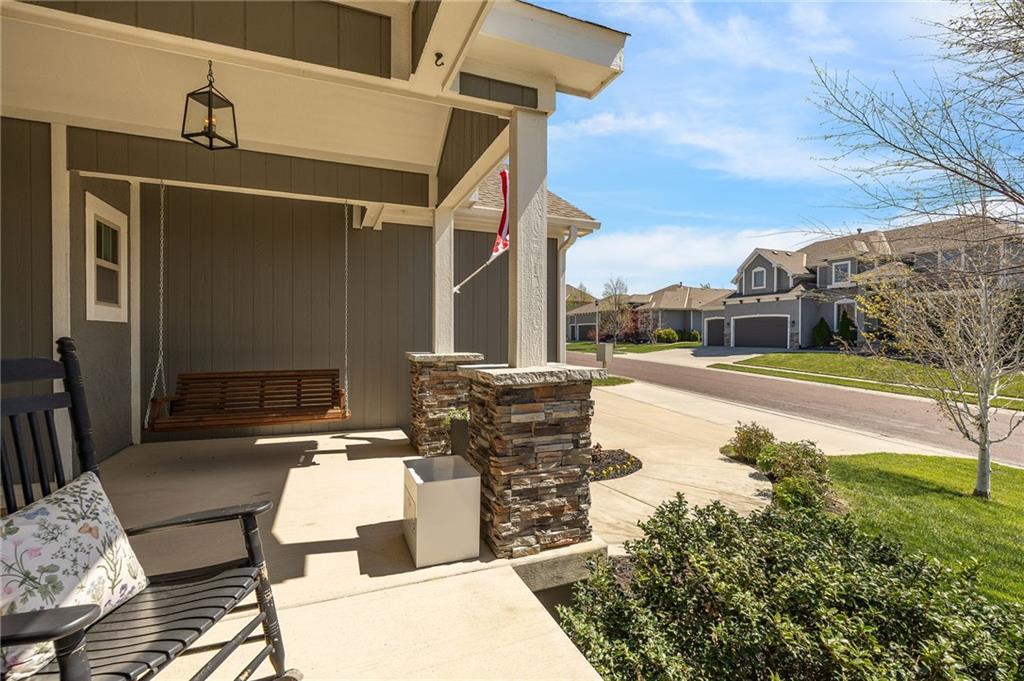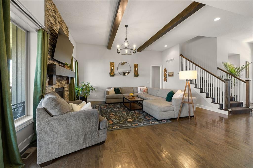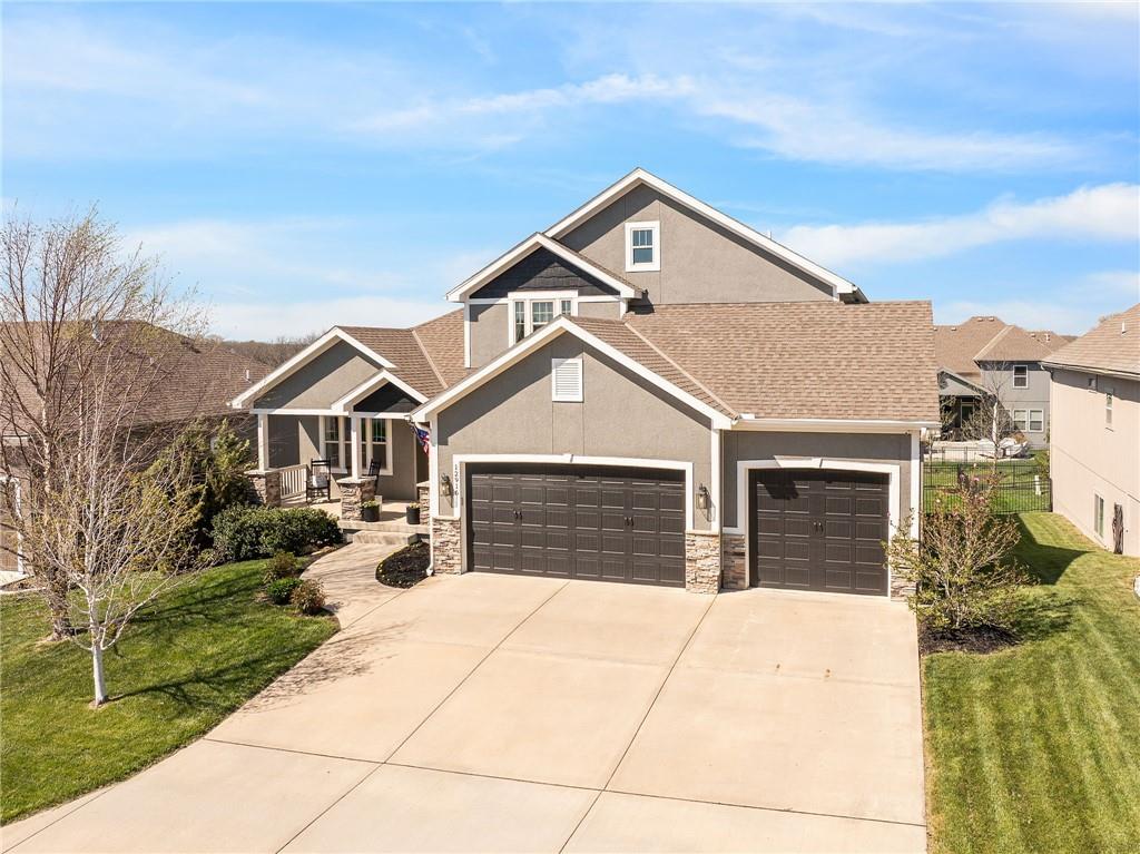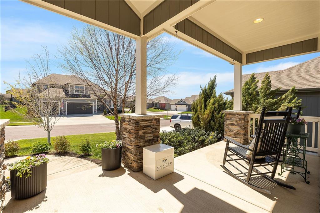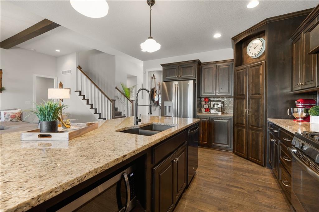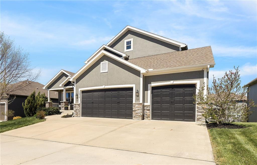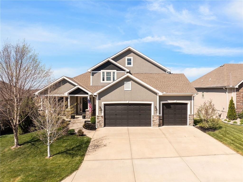 Stunning home in sought-after Chapel Hill, offering exceptional community amenities including two pools, clubhouse, playground, pickleball courts, and miles of scenic walking trails. A charming covered front porch welcomes you into a wood floor foyer, with hardwoods flowing throughout the main living areas, half bath, and mudroom. Thoughtfully designed, the mudroom features built-in bench seating, coat hooks, and cubbies, with convenient access to the garage and laundry room, which connects directly to the owner’s suite closet. The private main-level owner’s suite showcases a stepped ceiling, plush carpet, ceiling fan, and serene views of the wrought iron fenced backyard. The spa-like ensuite bath features tile flooring, a modern soaker tub, tiled shower, and direct access to the walk-in closet and laundry. The great room impresses with a wood-beamed ceiling, stone fireplace, and walls of windows, seamlessly opening to the kitchen and breakfast area. The kitchen is a true centerpiece with an oversized granite island with integral sink, walk-in pantry, stainless appliances, coffee nook, and butler’s pantry connecting to a front office or formal dining room with French doors. The breakfast area walks out to a covered deck, perfect for relaxing or entertaining. Upstairs offers four bedrooms, all with ceiling fans, including a private suite and a Hollywood bath shared between two bedrooms; all baths feature tile floors and granite counters. The finished walk-out lower level expands your living space with a family room, recreation area with wet bar, built-ins, microwave nook, and space for a full-size refrigerator. A fifth bedroom, full bath, and abundant storage complete the lower level. Enjoy outdoor living on the stamped and stained concrete patio within the fenced backyard. Ideally located near Heritage Park with golf, fishing, and an off-leash dog park just moments away.