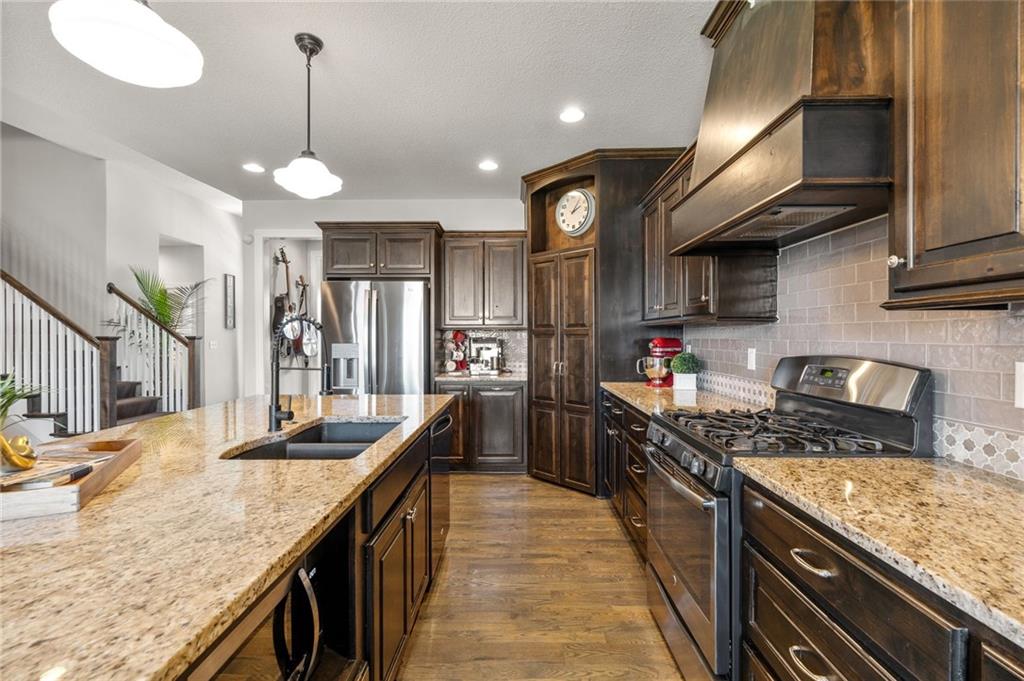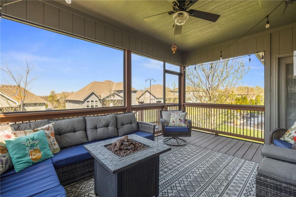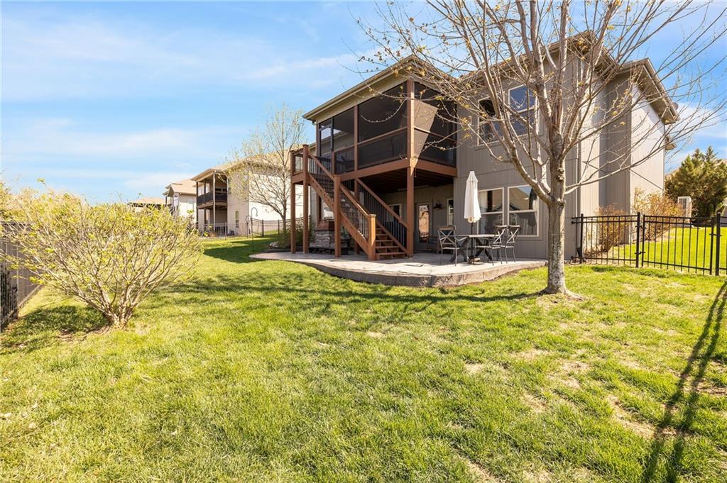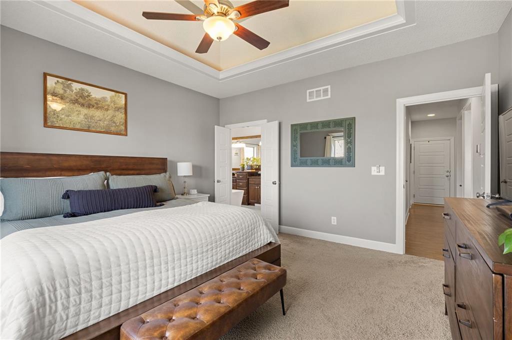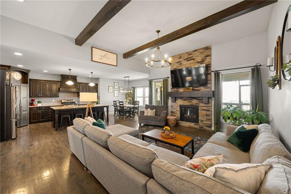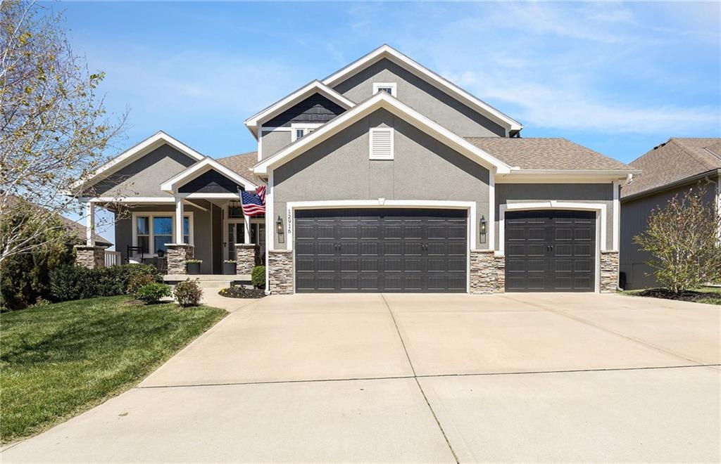 Stunning home in sought-after Chapel Hill, offering exceptional community amenities including two pools, clubhouse, playground, pickleball courts, and miles of scenic walking trails. A charming covered front porch welcomes you into a wood floor foyer, with hardwoods flowing throughout the main living areas, half bath, and mudroom. Thoughtfully designed, the mudroom features built-in bench seating, coat hooks, and cubbies, with convenient access to the garage and laundry room, which connects directly to the owner’s suite closet. The private main-level owner’s suite showcases a stepped ceiling, plush carpet, ceiling fan, and serene views of the wrought iron fenced backyard. The spa-like ensuite bath features tile flooring, a modern soaker tub, tiled shower, and direct access to the walk-in closet and laundry. The great room impresses with a wood-beamed ceiling, stone fireplace, and walls of windows, seamlessly opening to the kitchen and breakfast area. The kitchen is a true centerpiece with an oversized granite island with integral sink, walk-in pantry, stainless appliances, coffee nook, and butler’s pantry connecting to a front office or formal dining room with French doors. The breakfast area walks out to a covered deck, perfect for relaxing or entertaining. Upstairs offers four bedrooms, all with ceiling fans, including a private suite and a Hollywood bath shared between two bedrooms; all baths feature tile floors and granite counters. The finished walk-out lower level expands your living space with a family room, recreation area with wet bar, built-ins, microwave nook, and space for a full-size refrigerator. A fifth bedroom, full bath, and abundant storage complete the lower level. Enjoy outdoor living on the stamped and stained concrete patio within the fenced backyard. Ideally located near Heritage Park with golf, fishing, and an off-leash dog park just moments away.