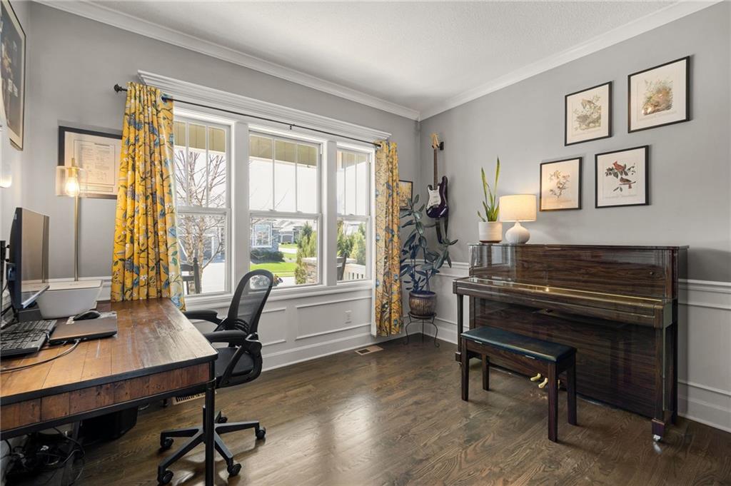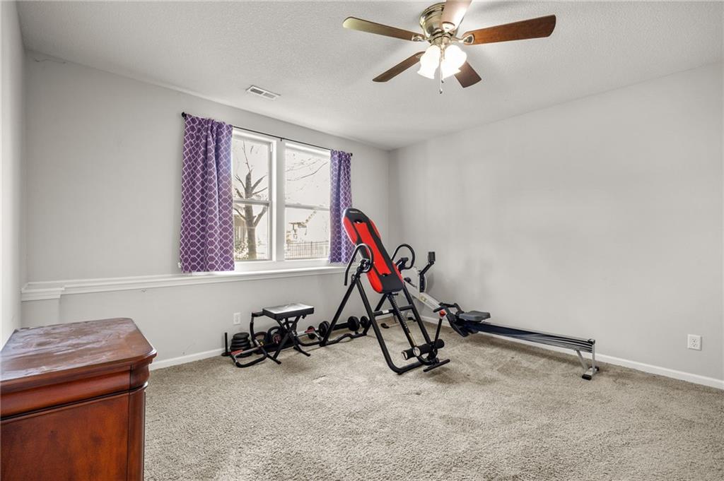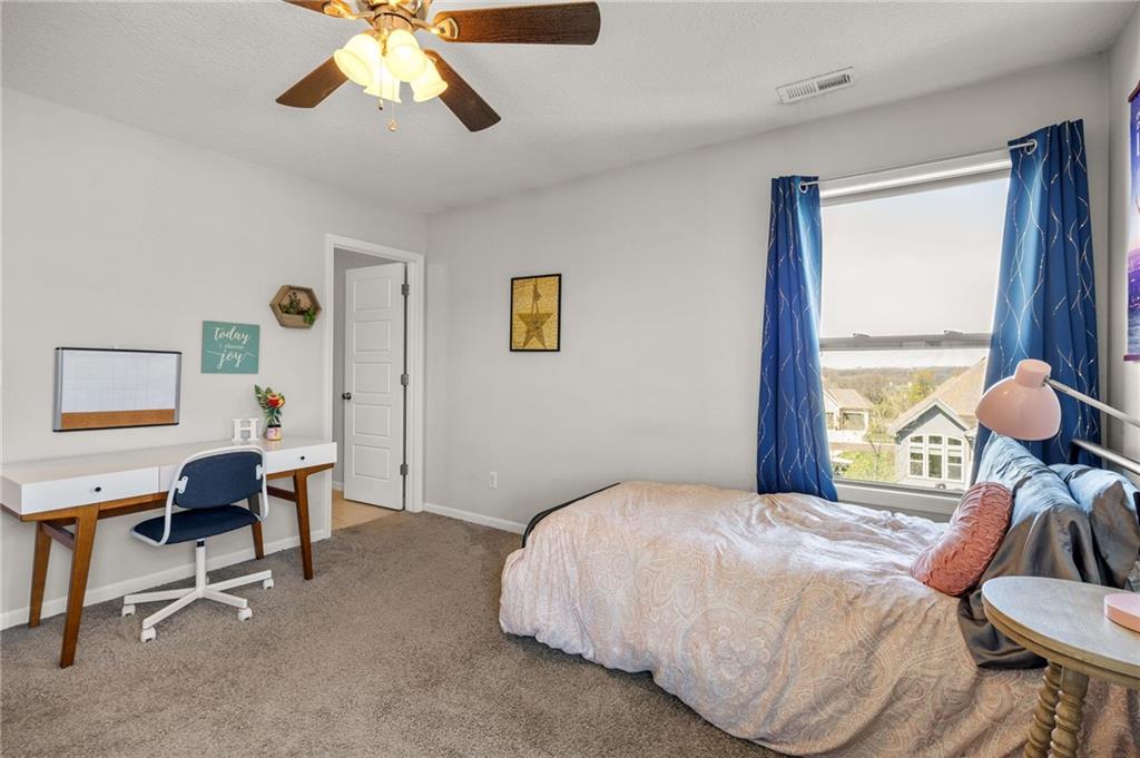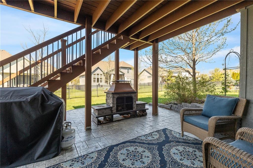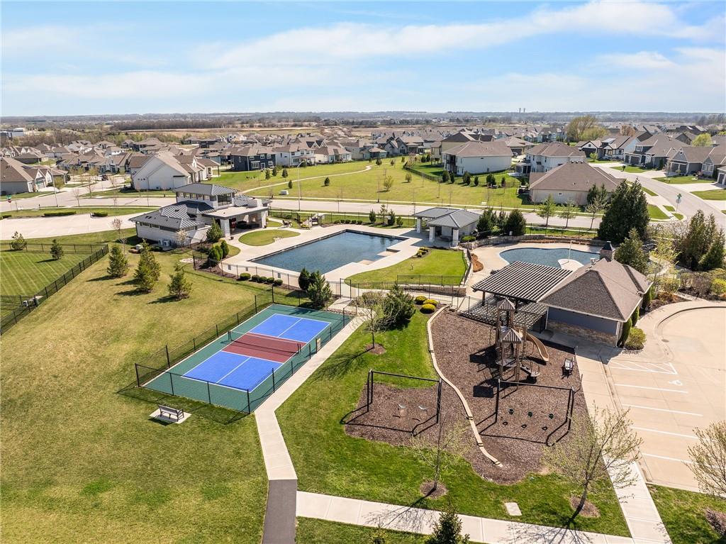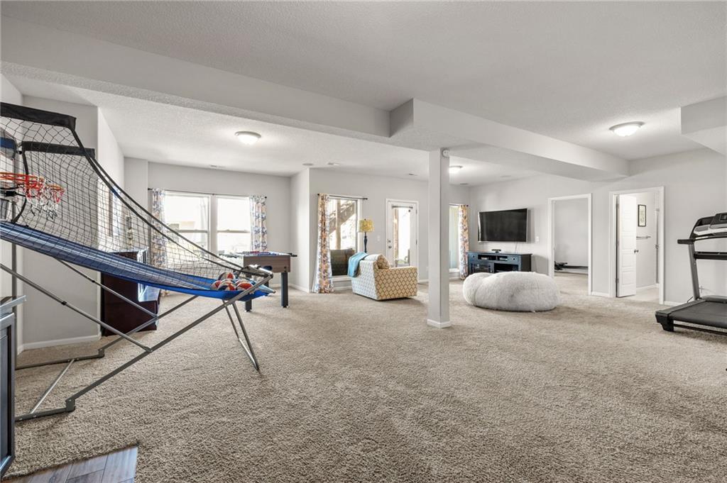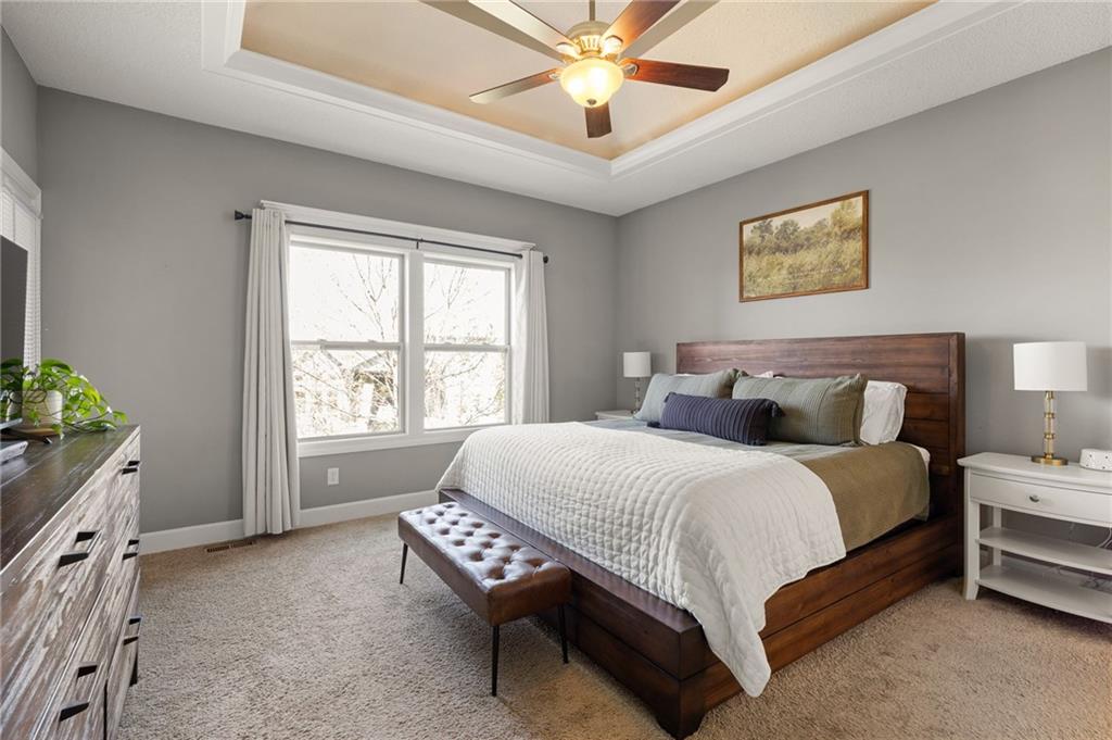 Stunning home in sought-after Chapel Hill, offering exceptional community amenities including two pools, clubhouse, playground, pickleball courts, and miles of scenic walking trails. A charming covered front porch welcomes you into a wood floor foyer, with hardwoods flowing throughout the main living areas, half bath, and mudroom. Thoughtfully designed, the mudroom features built-in bench seating, coat hooks, and cubbies, with convenient access to the garage and laundry room, which connects directly to the owner’s suite closet. The private main-level owner’s suite showcases a stepped ceiling, plush carpet, ceiling fan, and serene views of the wrought iron fenced backyard. The spa-like ensuite bath features tile flooring, a modern soaker tub, tiled shower, and direct access to the walk-in closet and laundry. The great room impresses with a wood-beamed ceiling, stone fireplace, and walls of windows, seamlessly opening to the kitchen and breakfast area. The kitchen is a true centerpiece with an oversized granite island with integral sink, walk-in pantry, stainless appliances, coffee nook, and butler’s pantry connecting to a front office or formal dining room with French doors. The breakfast area walks out to a covered deck, perfect for relaxing or entertaining. Upstairs offers four bedrooms, all with ceiling fans, including a private suite and a Hollywood bath shared between two bedrooms; all baths feature tile floors and granite counters. The finished walk-out lower level expands your living space with a family room, recreation area with wet bar, built-ins, microwave nook, and space for a full-size refrigerator. A fifth bedroom, full bath, and abundant storage complete the lower level. Enjoy outdoor living on the stamped and stained concrete patio within the fenced backyard. Ideally located near Heritage Park with golf, fishing, and an off-leash dog park just moments away.