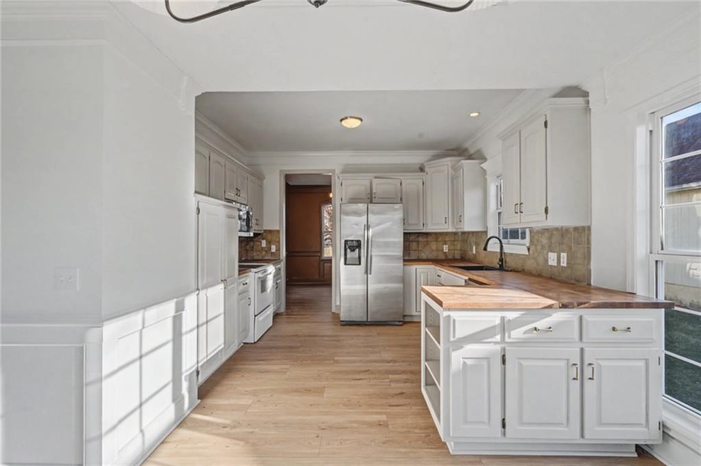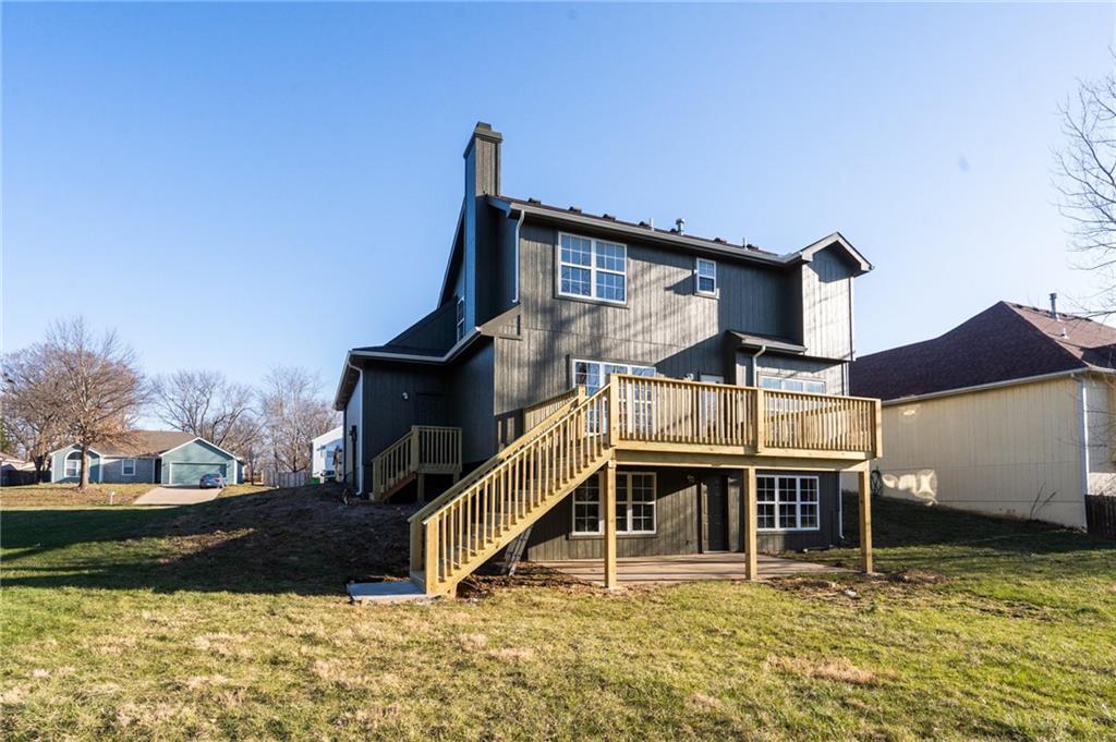 This beautifully refreshed home near Baker University offers space, character, and thoughtful updates throughout. Located within walking distance to Lions Stadium, the property sits beside an empty lot and backs to peaceful greenspace, creating a sense of privacy while still being close to town. Inside, you'll find beautiful original woodwork and abundant natural light paired with major recent improvements, including new plumbing, new HVAC, new hot water heater, fresh interior and exterior paint, new carpet and LVP flooring, updated lighting, and new siding on the front of the home. A brand-new deck provides the perfect spot to enjoy the spacious, tree-lined yard. The main level features an inviting eat-in kitchen, formal dining room, and convenient main-level laundry. Upstairs offers three generous bedrooms and two full bathrooms, including a comfortable primary suite. The walkout basement adds additional living flexibility with a second living area and full bathroom, plus unfinished space with an egress window already in place, offering excellent potential for future expansion or additional bedrooms. With a solid foundation, classic craftsmanship, and extensive updates already completed, this home blends timeless character with modern improvements in a quiet, established neighborhood.