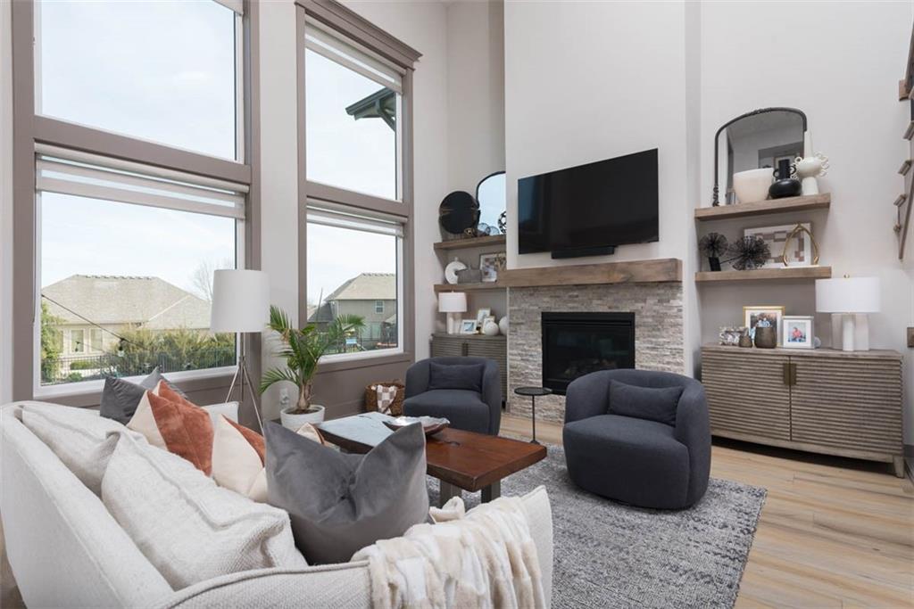 Designer’s personal KC Custom Home…bold, refined, and designed to be experienced, not just seen. Striking curb appeal pairs modern lines with warm stone accents, setting the tone before you even step inside. Soaring ceilings in the 2-Story great room and walls of windows fill the main level with natural light, creating an airy, inviting feel throughout. The living room makes a statement with its dramatic height and beautifully detailed fireplace, flowing seamlessly into a thoughtfully designed kitchen with a large statement island, custom-selected finishes, upgraded fixtures, built-in buffet, and a walk-in pantry that keeps everything effortlessly organized. Designed for both everyday living and hosting, the main level offers a spacious dining area overlooking the covered deck, along with a functional mudroom area and half bath that adds ease to daily routines. The primary suite delivers a true retreat with generous space, a spa-like bath with dual vanities and an oversized shower, and a boutique-style walk-in closet. Additional bedrooms are spacious and well-appointed, offering comfort and privacy for all. The lower level expands your living space with a second living area, stylish bar, additional bedrooms, full baths, and a dedicated exercise room, perfectly suited for entertaining or unwinding. Step outside to a covered deck that feels like an extension of the home, overlooking an XL cul-de-sac lot with a reinforced concrete slab ready for a hot tub and direct gated access to the neighborhood pool. Located just moments from Lake Lotawana’s local favorites and directly across from Stonehaus Farms Winery, this home offers not just beautiful design, but a lifestyle to match! Complete with designer-selected finishes, upgraded lighting, plumbing fixtures, custom blinds, and extended-height garage ceilings that truly set it apart. Truly a must see!