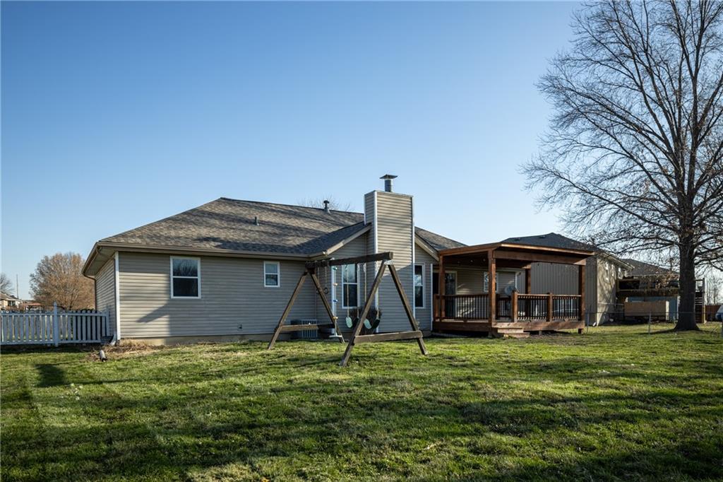 Location! Location Location! This well-maintained 3-bedroom, 2-bath ranch offers the ease and comfort of true one-level living. Nestled in the back of a quiet subdivision, this home offers a peaceful setting with minimal traffic and is within walking distance of Grain Valley Schools. The home features a 2 year old roof, low-maintenance exterior with durable vinyl siding and the convenience of main-level laundry. The finished basement expands your living space with a versatile layout that includes a rec room with a bar and a pool table, a family room that is perfect for movie nights and a bonus room that can serve as a home office, gym, or flex space. The basement is already stubbed for a future half bath, offering additional potential. Step outside to a large, level, fully fenced backyard with a newer covered deck (maintenance free decking)—an ideal space for relaxing or hosting guests. With no backyard neighbors and direct access to the scenic/paved Blue Branch Creek Trail, you’ll enjoy added privacy and a peaceful outdoor setting. This solid well-maintained home is ready for your personal touch, offering a great opportunity to add your own style through cosmetic updates. The seller is selling "as-is" with inspections welcomed.