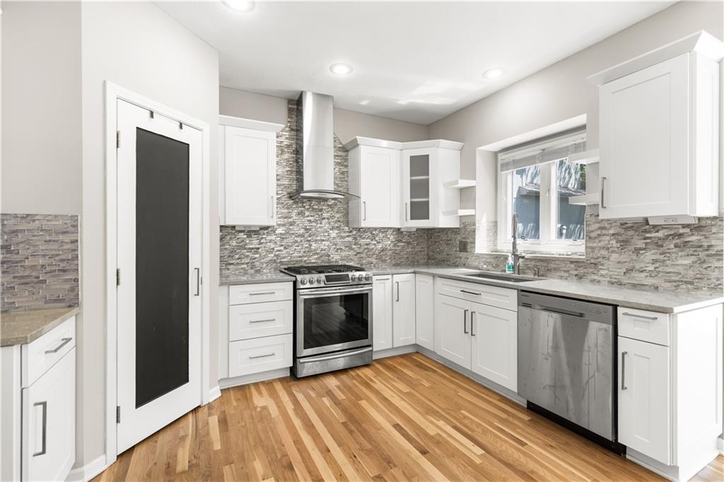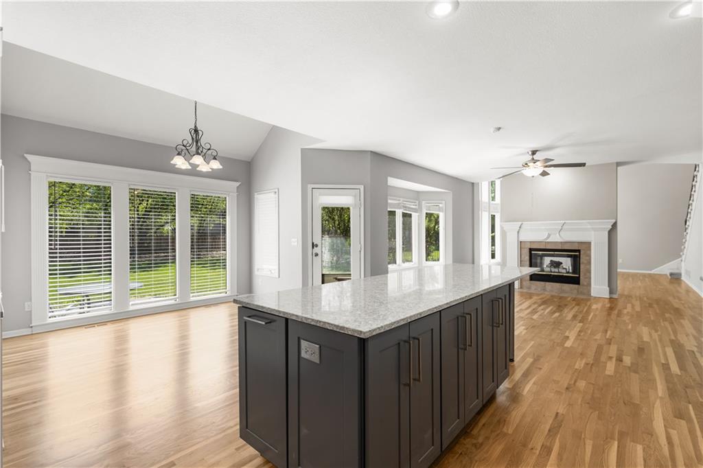 LOCATION! LOCATION! LOCATION! NEW INTERIOR PAINT, NEW CARPETS AND NEWLY FINISHED WOOD FLOORS! Welcome to this beautifully updated home in the highly sought-after Overland Park area, offering the perfect blend of comfort, style, and modern upgrades. Nestled on a quiet street, this spacious residence features an inviting open floor plan designed for both everyday living and effortless entertaining. Step inside to a stunning remodeled kitchen that is truly a cook’s delight—featuring an abundance of cabinetry, quartz countertops, a stylish tile backsplash, stainless steel appliances, and a show-stopping oversized quartz island. The kitchen opens to a generous dining and hearth area, creating the perfect gathering space, and flows seamlessly out to a large patio overlooking a beautiful, level backyard. The main level showcases newly refinished hardwood floors throughout, enhancing the home’s warmth and elegance. A spacious great room impresses with soaring ceilings, a see-through fireplace, and dramatic all-new floor-to-ceiling windows that flood the space with natural light. The inviting two-story entry is flanked by a formal dining room and a versatile den or home office. The main floor also has a full bathroom with shower. Upstairs, the expansive primary suite offers plenty of room for a sitting area, along with a walk-in closet and a beautifully updated en-suite bathroom. Three additional oversized bedrooms provide ample space—one featuring its own private updated bath, while the other two share a convenient Jack-and-Jill updated bathroom. The finished daylight lower level expands your living space with a full bathroom and offers plenty of unfinished area ideal for storage or a workshop. With its thoughtful updates, spacious layout, and prime location near top-rated schools, parks, shopping, and dining, this home truly has it all. Don’t miss your chance to make it yours!