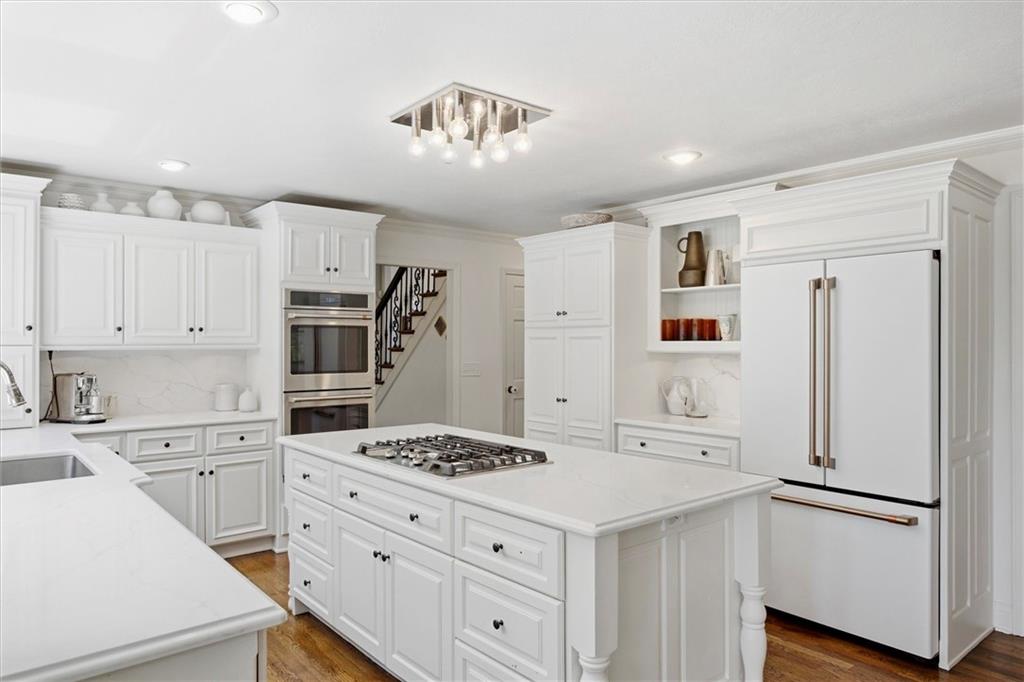 Located in Leawood’s highly sought after Berkshire neighborhood, 4245 W 124th Terrace offers timeless style, thoughtful upgrades, and true move in ready living. The updated kitchen features new quartz countertops and backsplash, brand new GE Café appliances, updated hardware, lighting, and freshly painted cabinetry. The main living area is bright and inviting, anchored by a marble fireplace that adds warmth and character. Fresh paint throughout, all new light fixtures, new carpet in the upstairs bedrooms, and new hardwood flooring in the primary, basement staircase and guest bedrooms create a clean, cohesive feel. The primary suite is a true retreat with views of the beautifully landscaped backyard. The fully remodeled bath features a marble walk in shower and solid surface soaking tub, creating a spa like setting. Expanded closet space adds even more functionality. The walkout basement offers a flexible open layout ideal for entertaining, movie nights, workouts, or relaxing, with direct access to a covered outdoor sitting area and large patio. The exterior has been enhanced with new gutters, a composite deck with waterproofing gutter system, and a refreshed front elevation with Andersen windows, new stucco, Hardie Board siding, and a metal roof accent. The landscaping has been beautifully restored, and the home also features a durable stone coated steel roof and sprinkler system with smartphone control. Significant investments include two new HVAC systems, updated ductwork, whole home water filtration and softener system, improved attic ventilation with added baffles, restored ridge vent airflow, new attic and garage insulation, and chimney and fireplace repairs. This is a rare opportunity to own a beautifully updated home where the work has already been done in one of Leawood’s most desirable neighborhoods.