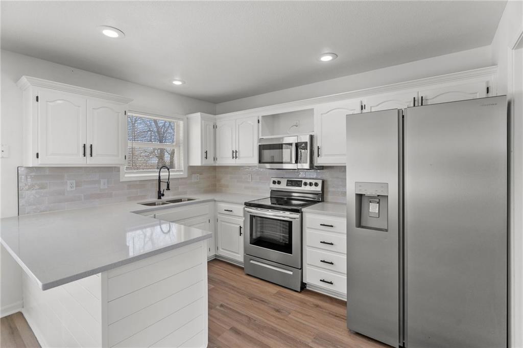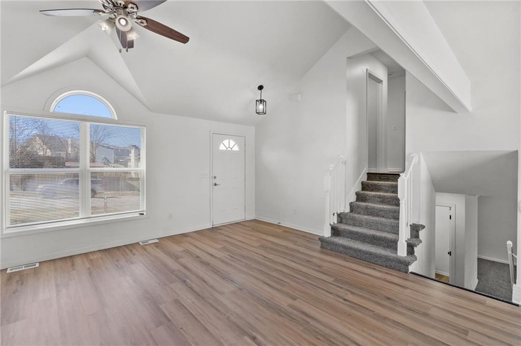 BEAUTIFULLY Updated and Move-in ready, this side-by-side split offers the perfect blend of modern finishes and functional living spaces. Main level welcomes you with a vaulted great room featuring a cozy fireplace, luxury vinyl flooring and an open layout ideal for everyday living and entertaining. Light-filled white kitchen shines with stainless steel appliances, quartz countertops and flows seamlessly into the dining area, where sliding doors lead to a spacious deck—perfect for indoor/outdoor gatherings. Upstairs, the primary suite boasts a private en-suite bath, while two additional bedrooms share a second full bath. Convenient bedroom-level laundry adds ease to your daily routine. The lower (garage-level) family room provides additional living space and walks out to a patio, offering another great spot to relax or entertain. A fourth bedroom in the basement adds flexibility for guests, a home office or workout space. Enjoy the fully fenced backyard and a fantastic location close to shopping, dining and quick highway access. JUST BRING YOUR DECOR AND MOVE RIGHT IN! WELCOME HOME!