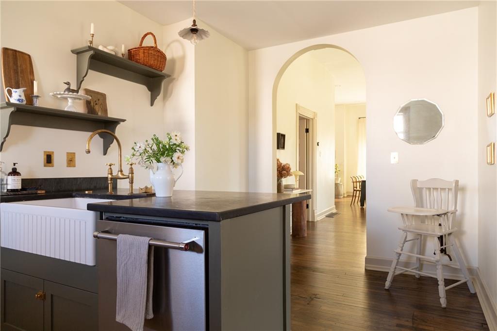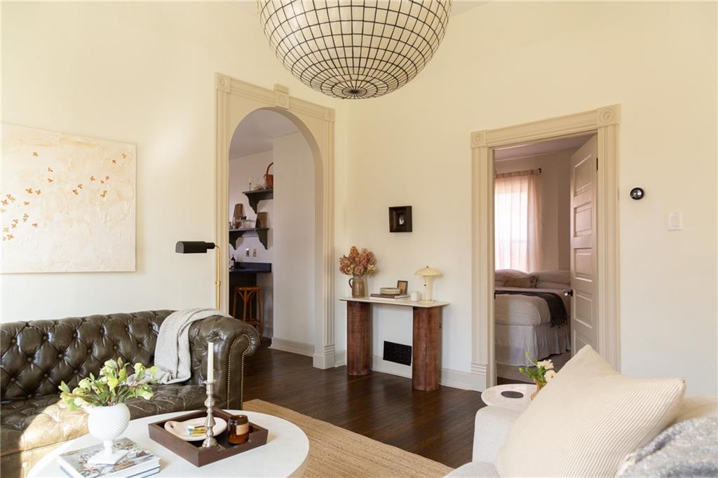 Buttery hardwood floors, tall ceilings, and natural light give this updated Victorian its unmistakable character. An elevated, custom renovation brings clarity and refinement to the original architecture, pairing sculptural millwork, reclaimed elements, and exposed brick with carefully chosen details throughout. Living and dining spaces connect fluidly, comfortable for everyday life yet generous when entertaining. The kitchen reflects the same level of intention, with quartzite and soapstone countertops, well-appointed cabinetry, tailored brass hardware, walk in pantry storage, and a high-end appliance suite chosen for beauty and performance. Both full baths are equally well considered, featuring elevated fixtures, curated tile selection, and finely detailed hardware. An exquisite lighting collection adds warmth throughout, while custom Marvin windows frame leafy neighborhood views along historic Olive Street. Outdoor living is an extension of the home itself, including an inviting wrap around front porch and two spacious rear decks overlooking a rare double lot. A front entry garage and ample off-street parking provide everyday ease, while the full, unfinished basement offers expansive storage capacity. Recent updates to major systems and the roof add confidence, with a long-term tax freeze providing welcome financial ease. This polished home is located in downtown’s Upper East Side neighborhood of Pendleton Heights, a historic district known for its character, walkability, and strong sense of community.
