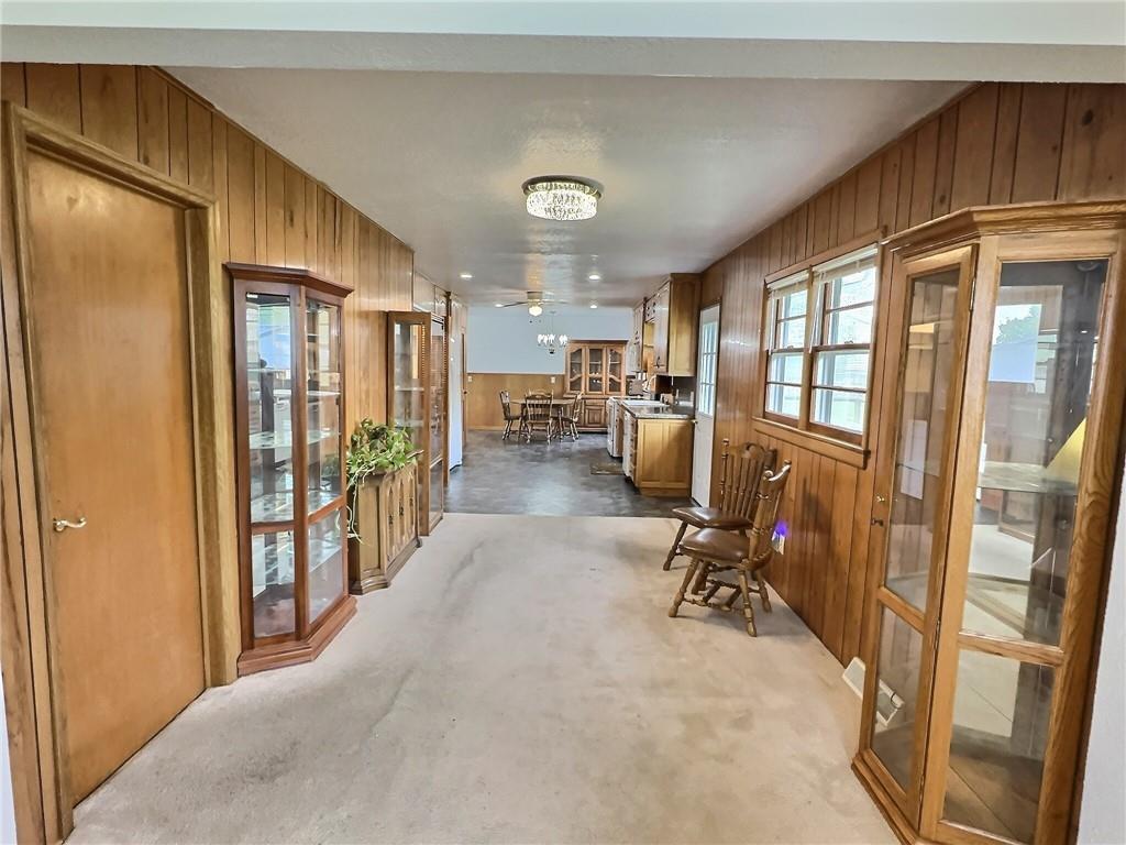Hallway with wood walls, concrete flooring, plenty of natural light, and recessed lighting