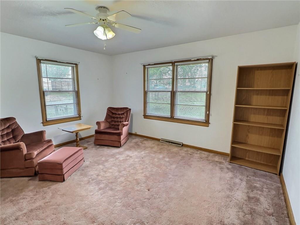 Sitting room featuring plenty of natural light, carpet floors, and a ceiling fan