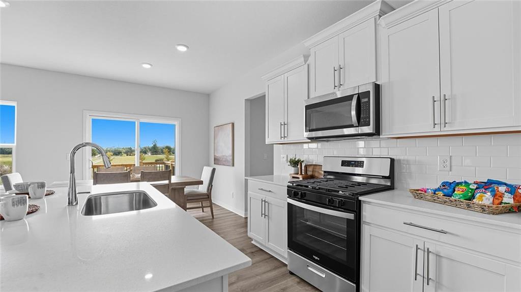 The Reagan is a ranch plan featured at Prairie Trace. This is a spacious and modern home designed with open-concept living carefully considered throughout. This home features four bedrooms, three and a half bathrooms, finished basement and a three-car garage. An inviting foyer greets you upon entering and leads you into the heart of the home. This open plan features a family room, dining room, and kitchen designed with entertaining in mind. The kitchen is equipped with a pantry, 36" cabinets with crown molding, quartz countertops with tile backsplash, stainless steel appliances, and a large island with a breakfast bar, making it perfect for both dining and guests. The luxurious primary suite offers a large walk-in closet and a primary bathroom with dual vanities and plenty of space to get ready. The additional two bedrooms share access to the secondary bathroom on the opposite side of the home offering privacy from the primary suite. With its thoughtful design, this ranch floorplan is the perfect place to call home at Prairie Trace. Pictures are representative.