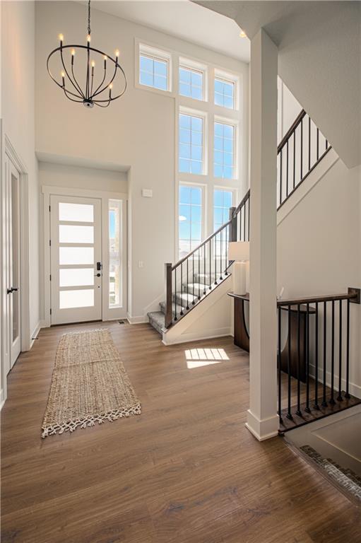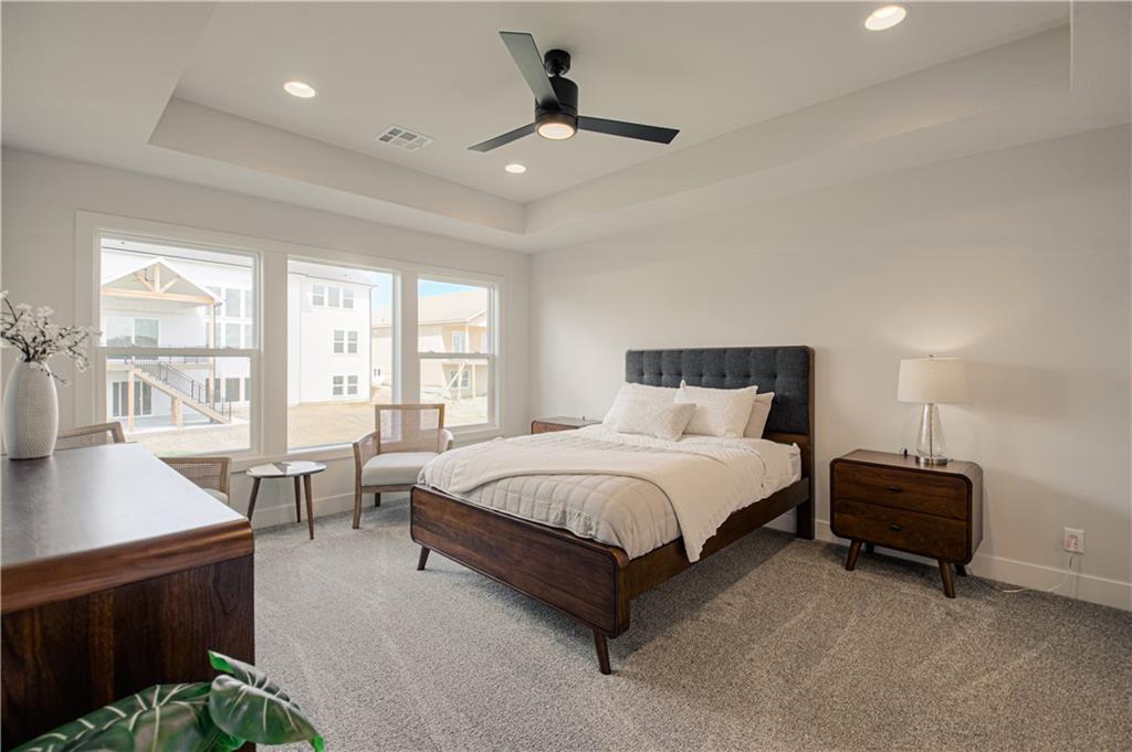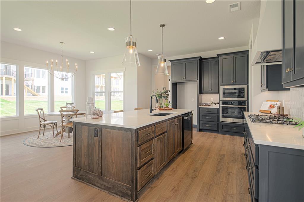 Step into the Inspired Homes 2-story Delano and experience a design that immediately stands out. A dramatic grand entry with 18-foot ceilings welcomes you in and flows seamlessly into the open-concept great room and kitchen. The main living area offers plenty of space to relax and entertain, featuring a striking floor-to-ceiling fireplace with built-in cabinetry, a generous dining area surrounded by wall-to-wall windows, and a thoughtfully designed kitchen. You’ll love the oversized walk-in pantry, upgraded quartz countertops, stylish tile backsplash, soft-close custom cabinetry, and modern lighting throughout. On the main level, a private bedroom and full bath provide the perfect setup for guests, a home office, or a playroom. Near the front entry, a convenient pocket office with a window brings in natural light—ideal for working from home. Upstairs, you’ll find three spacious secondary bedrooms, each with walk-in closets and built-ins, including one with its own private bath. The primary suite is tucked away at the back of the hall and features a luxurious en-suite bath with a soaking tub, dual vanities, and a large dual-head shower. The adjoining walk-in closet is truly exceptional, with two separate wings and a hidden bonus room—perfect for a private office, workout space, or creative retreat. Outside, enjoy a large, flat backyard and an oversized covered patio—perfect for entertaining or relaxing. The expanded 3-car garage offers extra depth and is complemented by a spacious driveway. The full unfinished basement includes plumbing stubs for a future bathroom and wet bar, for endless possibilities to customize the space. Located in the desirable Pryor Ridge community, residents enjoy exceptional amenities including a junior competition-sized pool, playground, basketball and pickleball courts, off-leash dog park, open green spaces, and scenic walking trails. All of this is just minutes from shopping, dining, groceries, entertainment, and easy highway access.