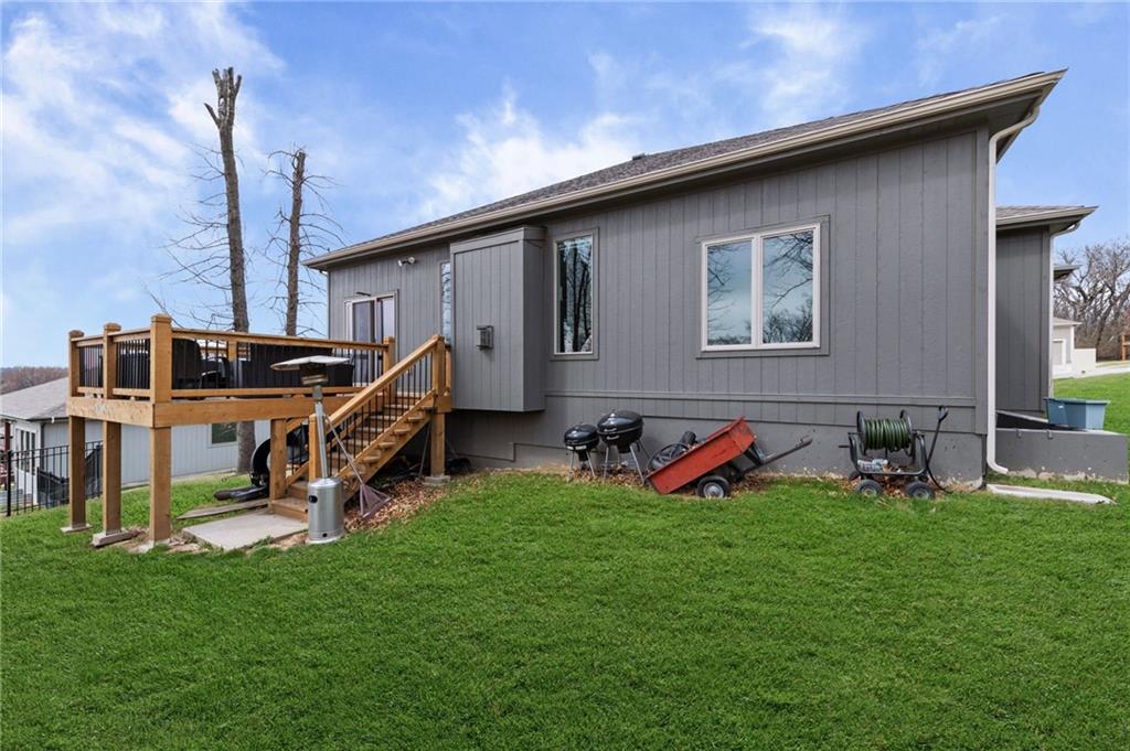 Welcome to this inviting reverse 1.5-story home that offers comfortable living, thoughtful design, and a hard-to-beat location. The main level features an open and functional layout with a spacious kitchen complete with granite countertops, a pantry, and a center island with a sink, making meal prep and entertaining easy. The kitchen flows seamlessly into the breakfast area and great room, where a cozy fireplace is framed by large windows on each side, filling the space with natural light and backyard views. The primary suite provides a relaxing retreat with a bathroom that includes dual sinks, a soaking tub, a separate toilet room, and a large walk-in closet with built-in shelving. Also on the main level is a second bedroom, a full bathroom with shower, and a laundry room with cabinet storage for added convenience. The finished lower level expands the living space with a large family room featuring a big window for natural light, along with third and fourth bedrooms and a full bathroom with a shower over the tub, offering plenty of room for guests, hobbies, or a home office. Step outside to enjoy the deck overlooking a treed, partially fenced backyard, providing a peaceful setting for relaxing or entertaining. Located in a prime area with easy access to downtown and the airport, this home combines space, comfort, and convenience.