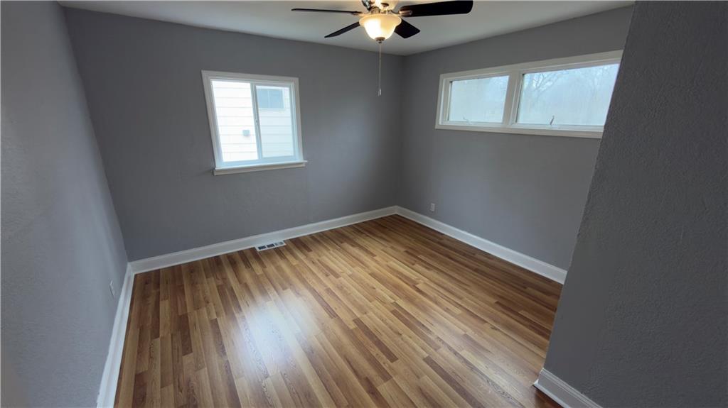 Completely renovated and move-in ready, this home features a clean, modern design with thoughtful finishes throughout. The exterior offers fresh, light-colored siding contrasted by black trim, a matching black front door, and a black garage door, creating a sharp, contemporary look. A newly painted concrete front porch provides a functional and inviting entry space. Inside, the home showcases durable wood-look flooring with warm natural tones that pair well with a variety of furniture styles—from modern and minimalist to traditional pieces—making it easy to personalize each room. The walls are finished in a soft gray with crisp white trim, creating a neutral palette that enhances natural light and gives the space an open, airy feel. The living area flows seamlessly into the kitchen, where you’ll find white cabinetry, modern hardware, and a clean layout designed for both functionality and everyday living. A stainless steel side-by-side refrigerator is already in place, complemented by a stainless steel dishwasher and coordinating finishes that give the kitchen a cohesive, updated look. Bedrooms continue the same flooring and color scheme, each equipped with updated ceiling fans featuring dark blades and integrated lighting, adding both style and comfort. The consistent finishes throughout the home create a unified, polished feel. The bathroom has been fully updated with large-format tile featuring a marble-inspired design, extending from the tub surround to the flooring for a sleek, cohesive appearance. A built-in niche with accent tile adds both function and visual interest. The vanity includes a clean white countertop, modern faucet, and updated lighting fixture above a framed mirror, completing the space with a fresh, contemporary touch. Additional upgrades include updated windows that bring in natural light, modern lighting throughout, and clean, well-executed finishes that make this home truly turnkey. Seller licensed in KS and MO.