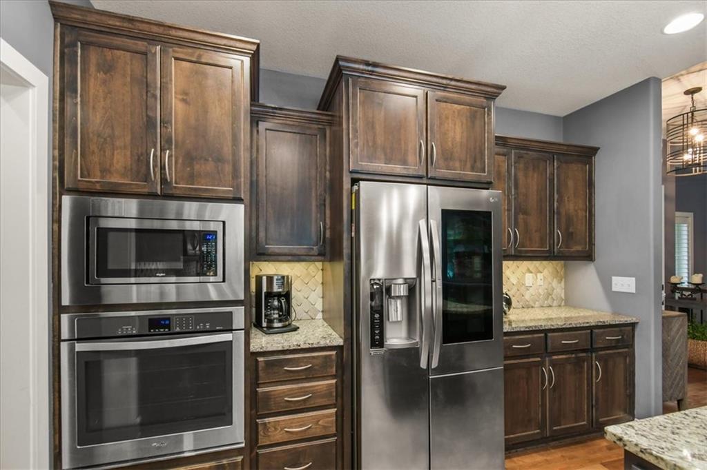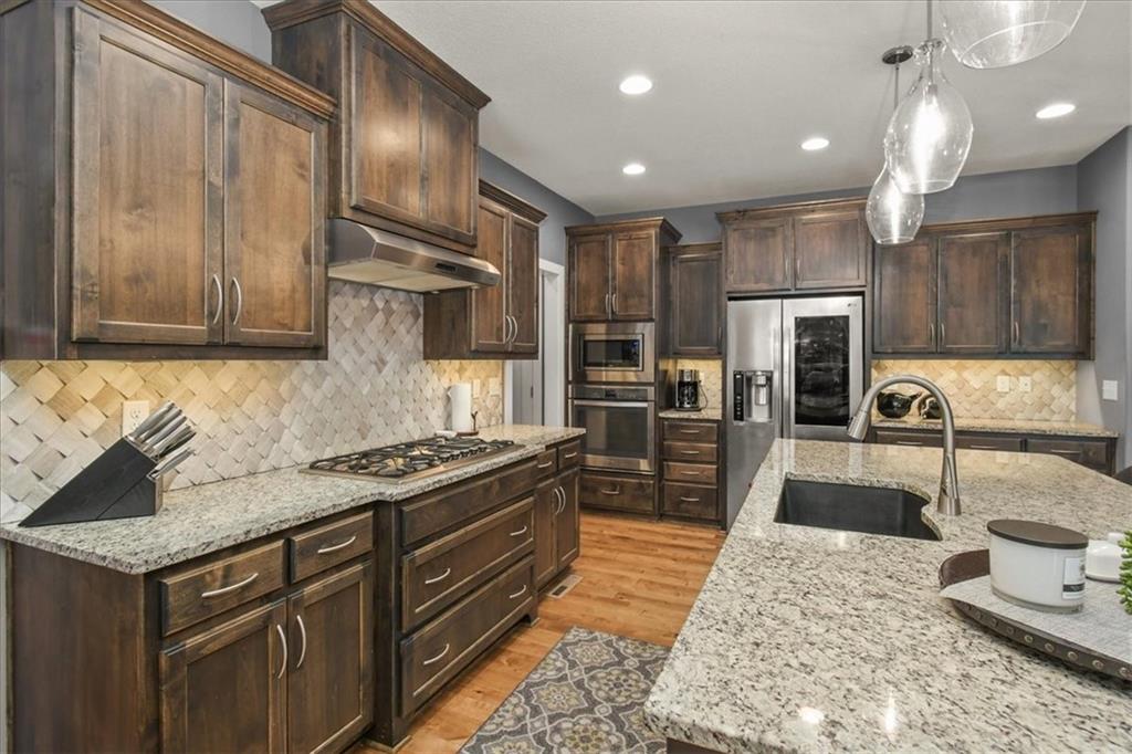 Prepare to be absolutely wowed by this ranch-style architectural masterpiece, a turnkey property where contemporary design meets luxurious, comfortable living. The home immediately impresses with its stunning façade of textured stucco and stacked stone accents, setting a sophisticated tone from the curb. Step inside onto gleaming hardwood floors that guide you through the expansive, open-concept design, flooded with natural light from oversized windows, most accented with custom plantation shutters. The heart of the home is the gourmet kitchen, a true chef's dream, showcasing rich, dark wood cabinetry equipped with soft close cabinets throughout, sleek granite countertops, and a show-stopping dark gray center island with seating—perfect for hosting and entertaining. Transition from the kitchen to the bright dining area and the spacious living room, anchored by a magnificent corner stone fireplace for cozy evenings. Retreat to the main floor private sanctuary in the primary suite, an oasis of calm with a stylish blue accent wall and an elegant tray ceiling that adds grandeur. The spa-like en-suite boasts a sleek double vanity with crisp white cabinetry, a glass-enclosed walk-in shower, and leads into a custom walk-in closet with ample built-in organization. Adding to the home's impressive functionality is a main-floor laundry room with gorgeous dark wood cabinetry, offering maximum convenience, complemented by a central vacuum system. For outdoor enjoyment, step onto the covered back patio, ideal for al-fresco dining or relaxing with a ceiling fan overhead. Below, the vast, unfinished basement presents a phenomenal opportunity to customize and expand—a blank canvas for adding a future home gym, theater, or additional living space to create your ultimate dream home. This is more than a home; it's an uncompromising quality lifestyle awaiting its new owner in a coveted community with excellent highway access for a convenient commute.