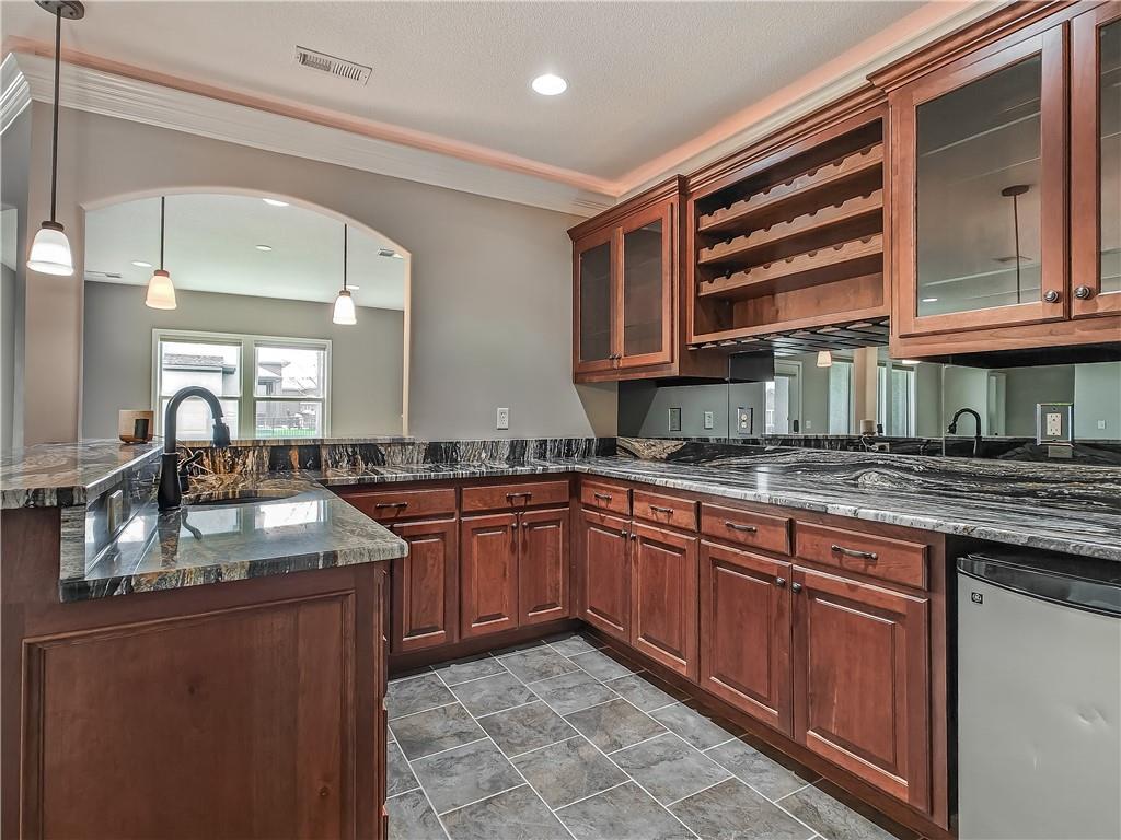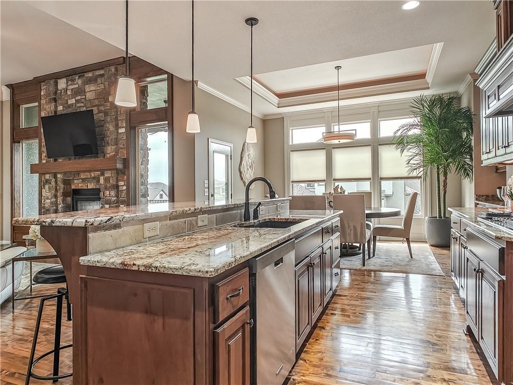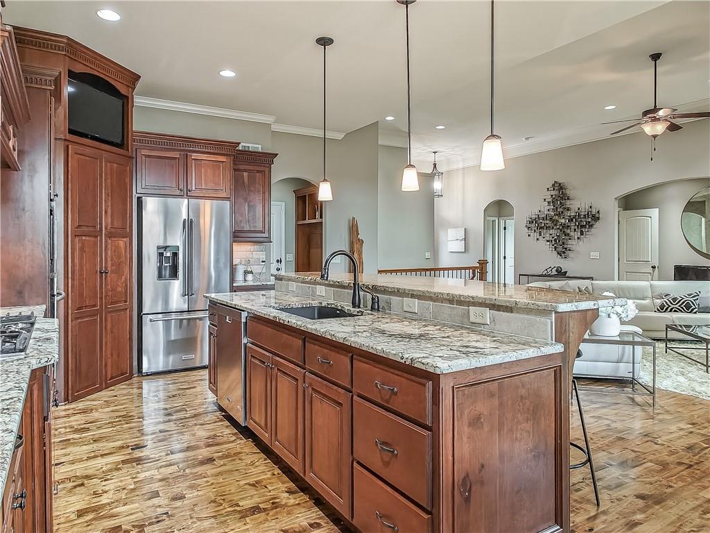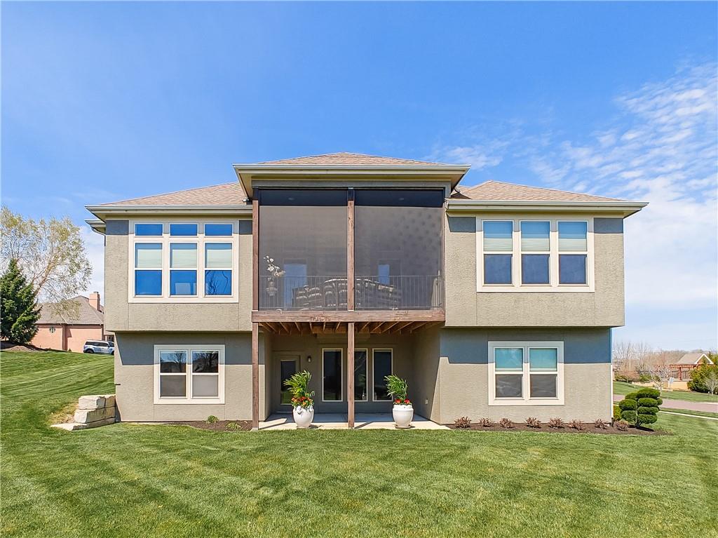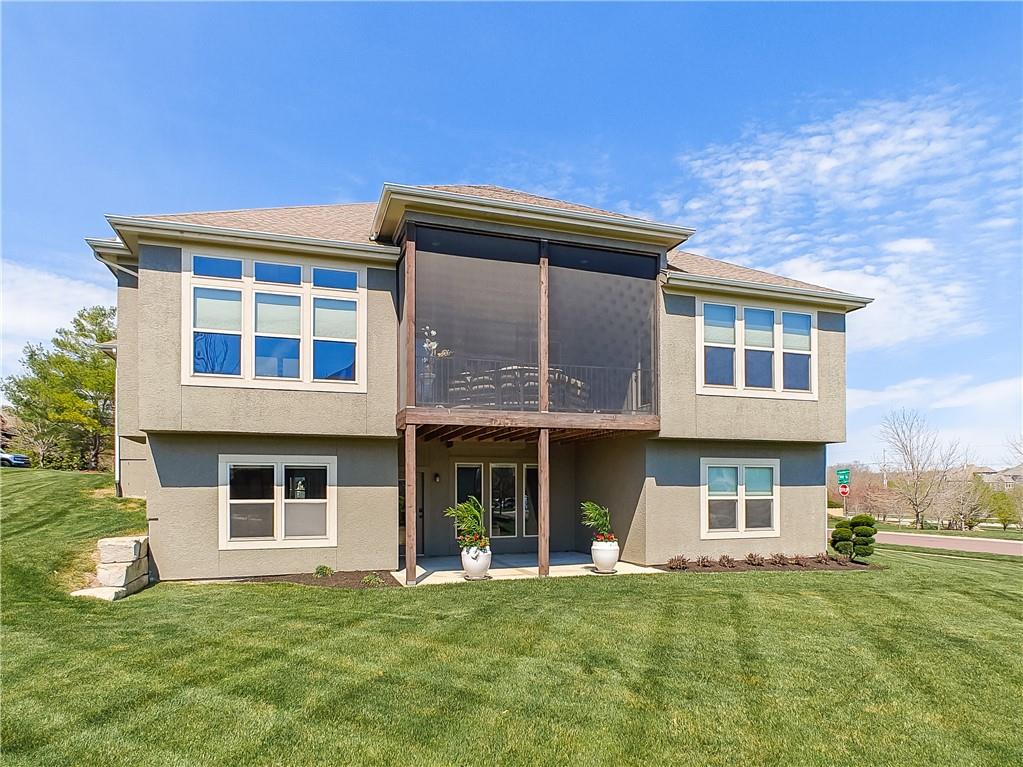Sensational walk-out reverse 1.5-story in sought-after Polo Fields, offering the perfect blend of open living, thoughtful design, and exceptional functionality. The expansive great room welcomes you with rich hardwood floors and a striking see-through direct vent fireplace, creating a warm connection between the living and entertaining spaces. The open layout flows seamlessly into the kitchen and dining area—ideal for both everyday living and hosting. The kitchen is a true centerpiece, featuring a large island, granite countertops, stainless steel appliances, and a spacious walk-in pantry. A conveniently located laundry room with utility sink sits just off the kitchen for added ease. This meticulously maintained home shines with a massive finished walk-out lower level designed for entertaining and versatility. Enjoy two separate rec spaces, a stylish wet bar with granite countertops, and a convenient half bath. Two additional bedrooms with a full bath provide the perfect setup for guests, family, or flexible living needs, plus abundant storage throughout. Step outside to relax or entertain on the private screened-in covered deck, or take in the outdoors from the lower-level patio—both offering peaceful, usable outdoor living spaces. Additional highlights include: • All stucco exterior for timeless curb appeal • Walk-out lower level • Instant hot water system • Storm shelter for peace of mind • Sprinkler system • Oversized 3-car garage with heaters and high-intensity lighting—perfect for hobbies, projects, or extra storage This home truly delivers space, comfort, and quality in one of the area’s most desirable communities.