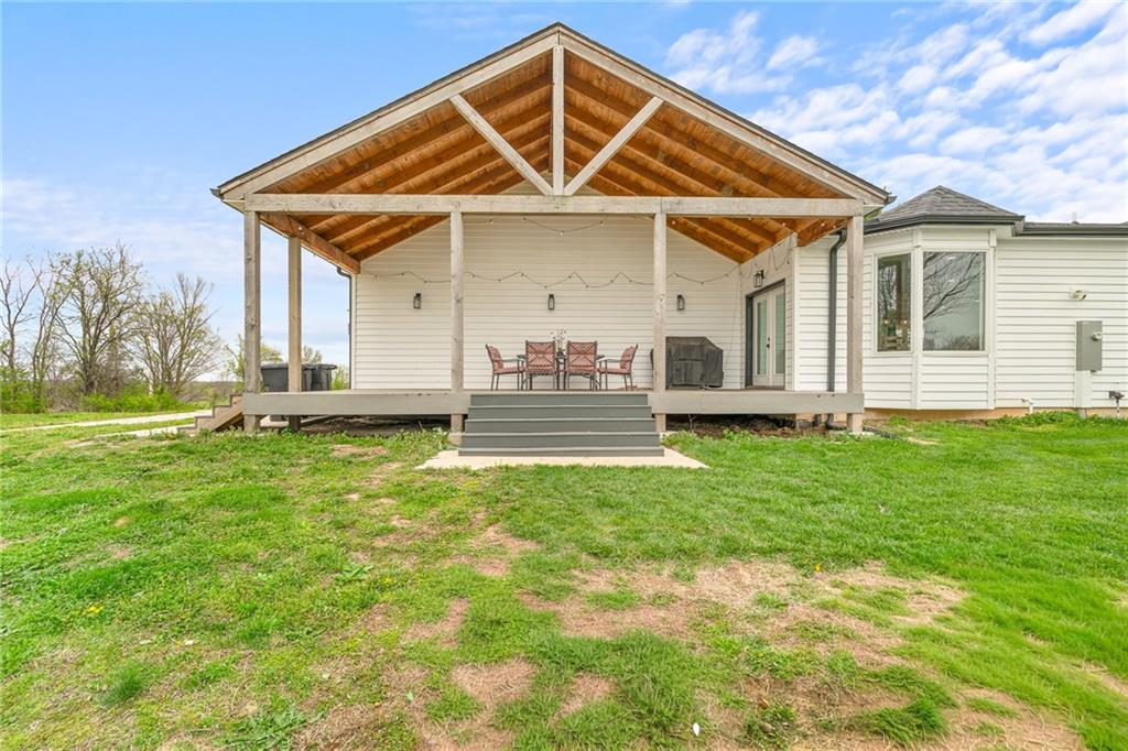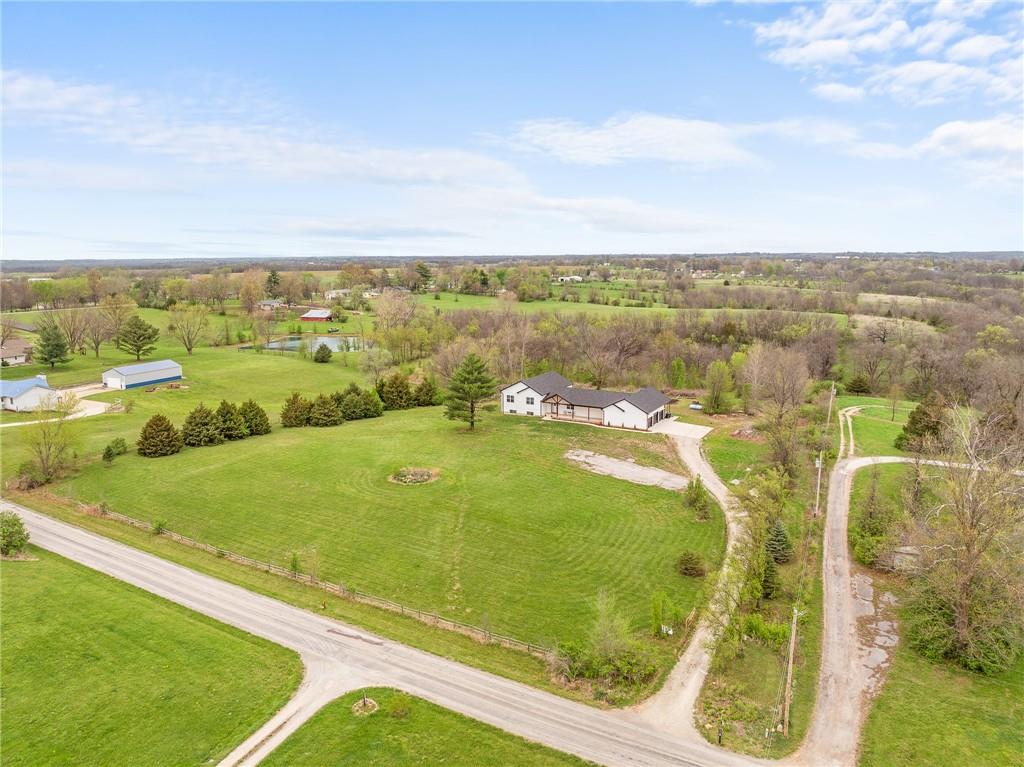 Start your mornings on the expansive 48-foot covered front porch, coffee in hand, as the quiet of the countryside and sweeping views ease you into the day. Set on 4.84± acres, featuring a beautiful newer home, this property offers a rare sense of space and privacy—perfect for those craving a slower pace without giving up convenience. Inside, thoughtful design meets everyday luxury. The open-concept floor plan is both inviting and functional, centered around a gourmet kitchen featuring custom white oak cabinetry, quartz countertops, double ovens, a Butler’s pantry, appliance lift, and an impressive 10-foot island—perfect for gathering. The adjoining family room is filled with natural light and anchored by a cozy gas fireplace. Upstairs, you’ll find generously sized bedrooms, including a serene primary suite retreat with a spa-inspired bath showcasing a 10-foot dual-head shower. Tucked beyond the expansive primary closet is a hidden office or flex space—ideal for working from home or a private escape. The finished walkout lower level offers even more room to live and entertain with 9-foot ceilings, two additional bedrooms, a full bath, and a large rec room. A substantial 8-foot concrete storm shelter provides peace of mind, while abundant storage keeps everything organized-1,600 square feet of unfinished endless potential. Car enthusiasts and pet lovers alike will appreciate the extended three-car garage with built-in dog wash. Out back, the elevated deck overlooks your acreage, with a concrete pad below already in place for a future hot tub—just imagine the evenings. With fiber internet, wide-open space, and endless possibilities, this property delivers the best of both worlds: modern comfort and the freedom of country living. Located 30 minutes to the Kansas City International airport and 35-40 minutes to downtown Kansas City. A rare opportunity to own acreage without compromise—offering endless potential to make it truly your own.