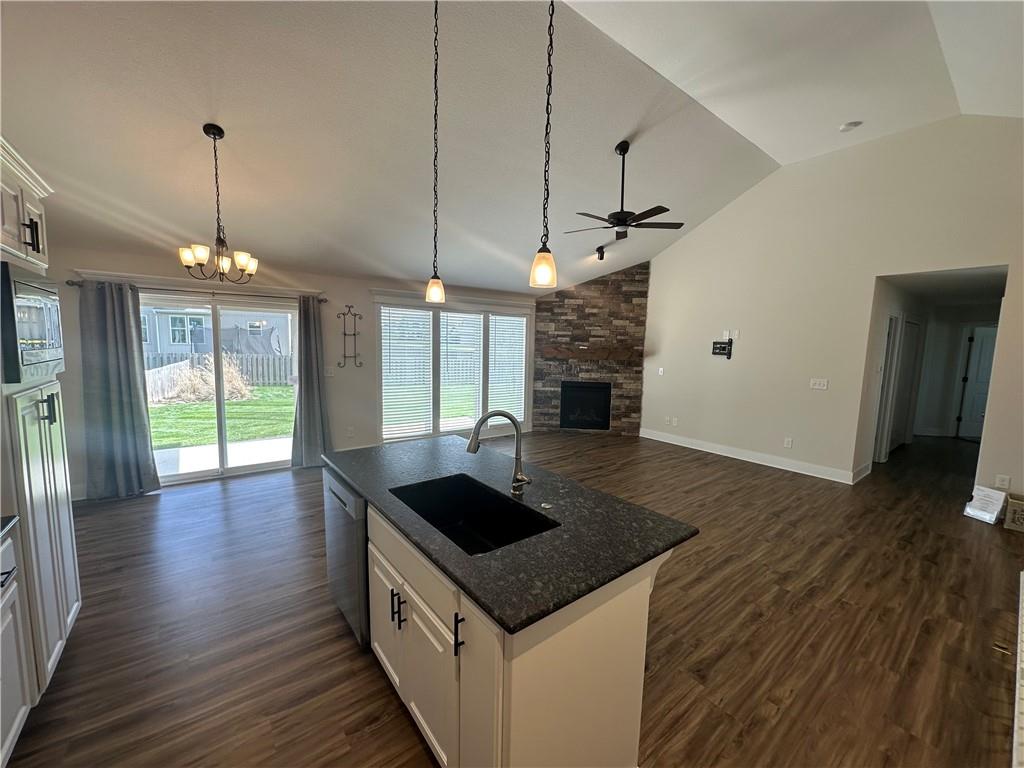 This home has just had a HUGE PRICE REDUCTION and is of amazing value! Welcome to this stunning ranch/reverse 1.5-story home, where thoughtful design and modern finishes come together seamlessly. The open-concept living room, kitchen, and breakfast area make a striking first impression with soaring cathedral ceilings, luxury vinyl plank flooring, and expansive windows that bathe the space in natural light. The kitchen is both stylish and functional, featuring upgraded granite countertops, a beautiful tile backsplash, painted cabinetry, and stainless steel appliances. Just off the kitchen, the breakfast area opens to a covered patio through sliding glass doors. The living room provides the perfect spot to relax, with a gorgeous fireplace. The primary suite is complete with vaulted ceilings, box bay windows overlooking the backyard, and lush carpet floors. The en suite bath offers a double vanity, a beautifully tiled walk-in shower with a built-in niche and granite bench, and a walk-in closet. Two additional bedrooms with generous closet space, a second full bathroom, and conveniently located laundry complete the main level. The builder-finished basement extends the living space with a fourth bedroom featuring a large egress window, a third full bathroom, and an expansive family room and recreation area—ideal for entertaining or relaxing. Situated on a generous corner lot, the home also features a large patio with both covered and uncovered areas, perfect for hosting BBQs or enjoying time outdoors. Notable upgrades include an irrigation system, buried downspouts, enhanced landscaping, a vertical garage door opener, and an expanded patio.