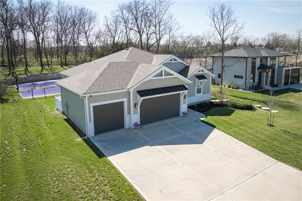 Experience resort-style living in this stunning 4.5-year-old reverse ranch with 4 bedrooms & 3 bathrooms with upscale finishes and exceptional amenities throughout. Designed for both everyday comfort & elevated entertaining, this home truly has it all. Step outside to your private oasis featuring a heated saltwater/chlorine pool complete with a built-in basketball goal, expansive outdoor kitchen with premium Blaze appliances & a half-court sport basketball court—perfect for hosting or relaxing in style. Inside, the main level showcases real 5” hardwood floors & a chef’s kitchen outfitted with top-of-the-line Café appliances, including an Advantium oven. A spacious walk-in butler’s pantry provides additional cabinetry & a beverage refrigerator for ultimate convenience. The finished basement is an entertainer’s dream, featuring a full-size bar with a built-in kegerator. The luxurious primary suite is a true retreat, boasting heated bathroom floors, dual shower heads including a rain feature, tall ceilings with a marble accent wall & a TV positioned above the soaking tub for added relaxation. The oversized walk-in closet includes a built-in dresser, custom shelving, and three-tiered hanging rods. Additional highlights include a functional mudroom off the garage, enhanced interior and exterior lighting, generously sized bedrooms with walk-in closets, and premium finishes throughout. Situated on over ¾ of an acre, the property offers a picturesque setting with mature trees, green space, and a striking stone wall. Enjoy exclusive access to the lake with a community dock slip and available lift lease, plus the added benefit of 2026 HOA fees covered for the new owner. The neighborhood enhances the lifestyle with amenities including a park, walking trails, pickleball and tennis courts, a yacht club & an upcoming community pool & clubhouse. Don’t miss this rare opportunity to own a home that perfectly blends luxury, recreation, and tranquility. *Owner/Agent*