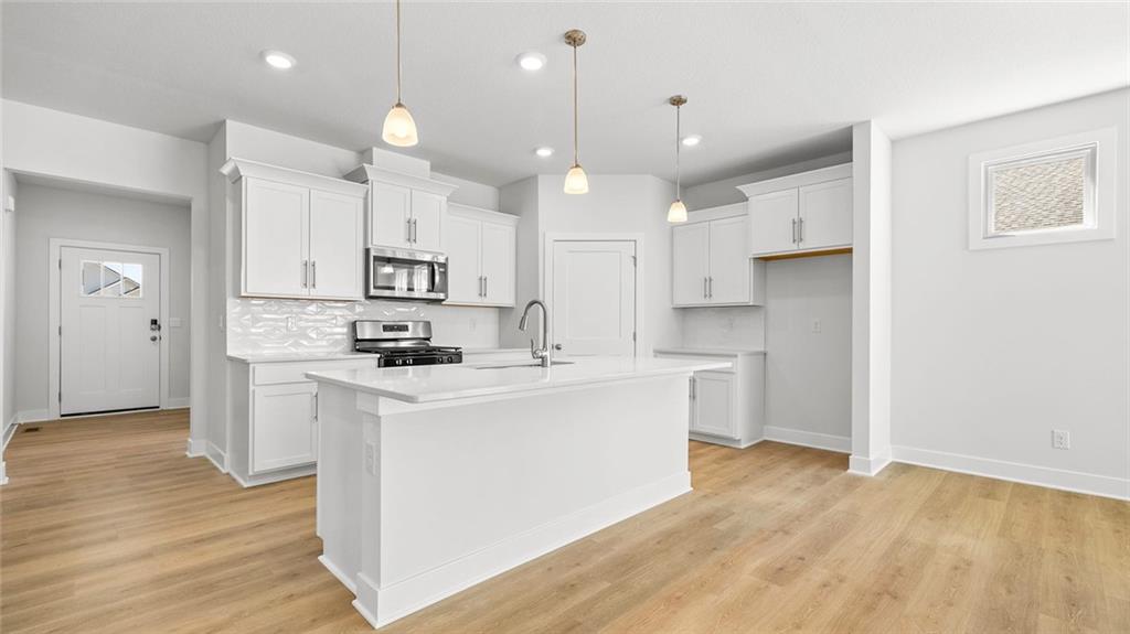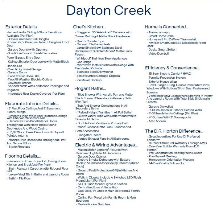 Arlington by D.R. Horton, backs to greenspace this home offers the convenience of main level living with the bonus of a finished inground basement(a recreational room, 4th bedroom perfect for guests or a home office, a full bathroom, and unfinished storage/mechanical space). The open-concept design includes a kitchen with an island, walk-in pantry, 36" cabinets with crown molding, quartz countertops, ceramic tile backsplash, large undermount sink, and Whirlpool stainless steel appliances including a gas range. The owner's retreat includes walk-in closet and en-suite bath. Featuring a tiled shower, "raised height" vanity with a quartz top, double bowls, and Moen® matte black fixtures throughout. 9' ceilings on both levels, a cozy stone fireplace, modern style baseboards and trim. Double wall exterior construction using durable James Hardie Siding features a 15-year color match guarantee makes this home maintenance friendly. Landscaped and sodded yards with irrigation, and a covered back deck provides ideal space for outdoor relaxation or entertaining. A 3-car garage with 10-ft ceilings provides abundant parking and storage. This home is built with quality craftsmanship and a suite of included luxury and smart home features that keep you connected including Wi-Fi Garage Door Openers, Deako Smart Switches, and a video doorbell. This home is backed by D.R. Horton's 1-2-10-year warranty offering exceptional values in the Dayton Creek Community. Spring Hill amenities include Golf Course, Aquatic Center, and Spring Hill School District holds a B+ grade on Niche.com. Don’t forget about Hillsdale Lake! Move-In ready homes available. Square feet and Taxes are estimated. Visit daytoncreek.com to see available lots and floor plans. Don’t forget to ask about our current incentives that can add even more value to these homes. Photos, renderings, and Virtual Walkthrough's maybe of a different home but on the same floor plan to show finish quality only.