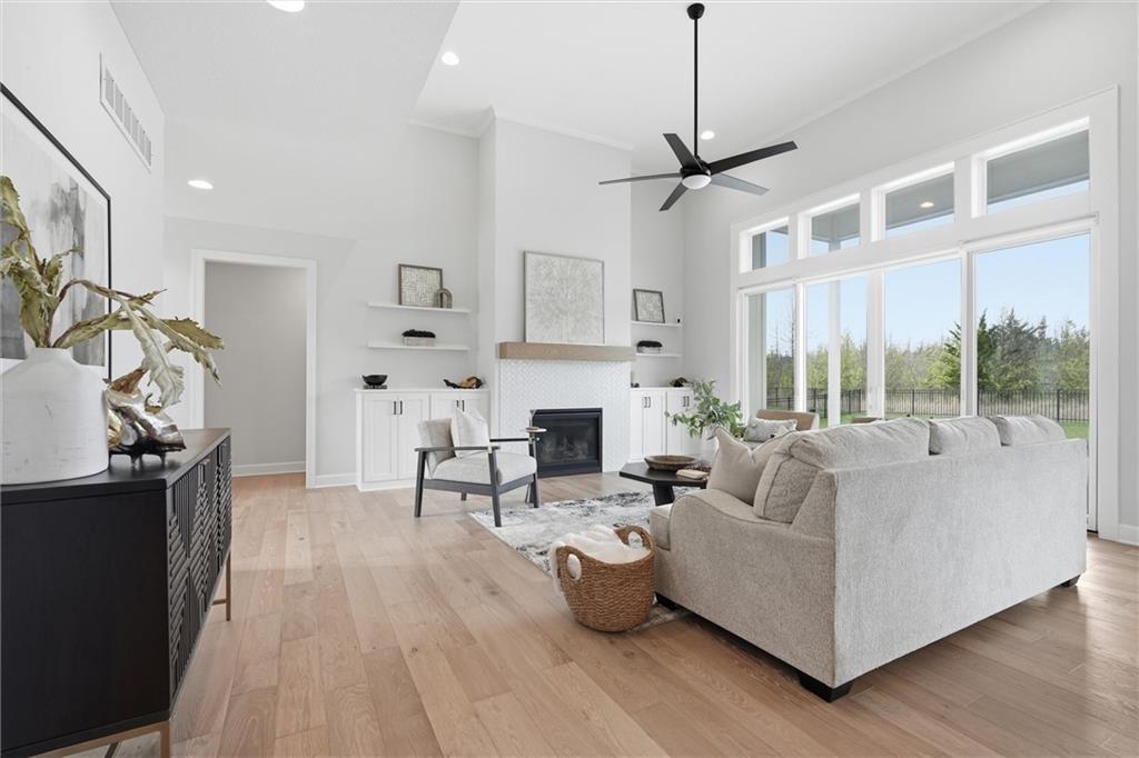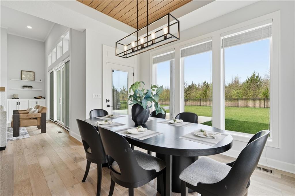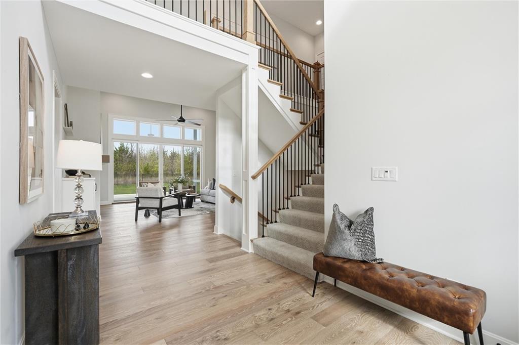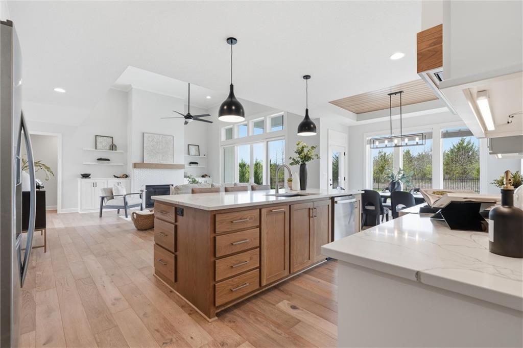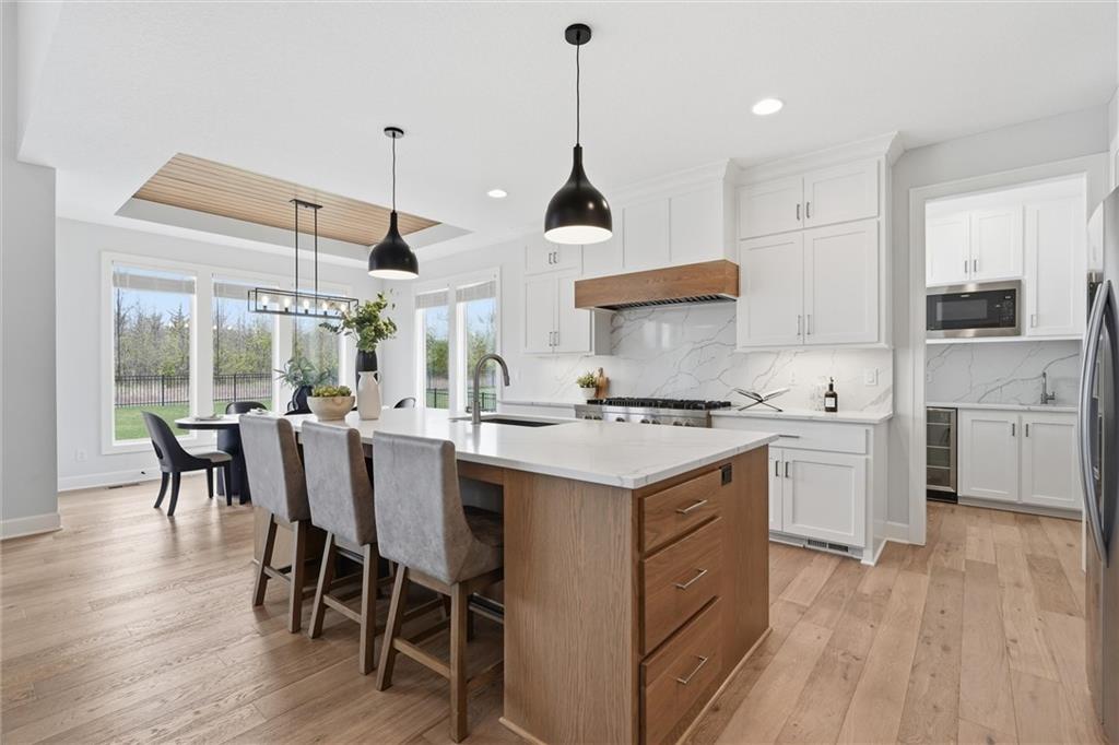 Meticulously maintained, like-new home that outshines new construction, offering a thoughtful open floor plan and seamless indoor-outdoor flow on a premium lot with a large private backyard and wooded views. The main level features a grand two-story entry, spacious living room, private office, and a gourmet kitchen with floor-to-ceiling white oak cabinetry and upgraded gas range. The main-level primary suite offers a spacious layout with convenient access to the laundry room. The upper level includes three generously sized bedrooms, each with walk-in closets and en suite baths. The finished lower level features a guest bedroom, full bath, wet bar, flex room/home gym, and ample storage. Enjoy abundant natural light throughout, along with beautiful sunset views from the backyard overlooking wooded green space. Move-in ready with convenient access to major commuting routes and located within the highly rated Blue Valley School District. Motivated sellers—come see this beautiful home and make an offer!